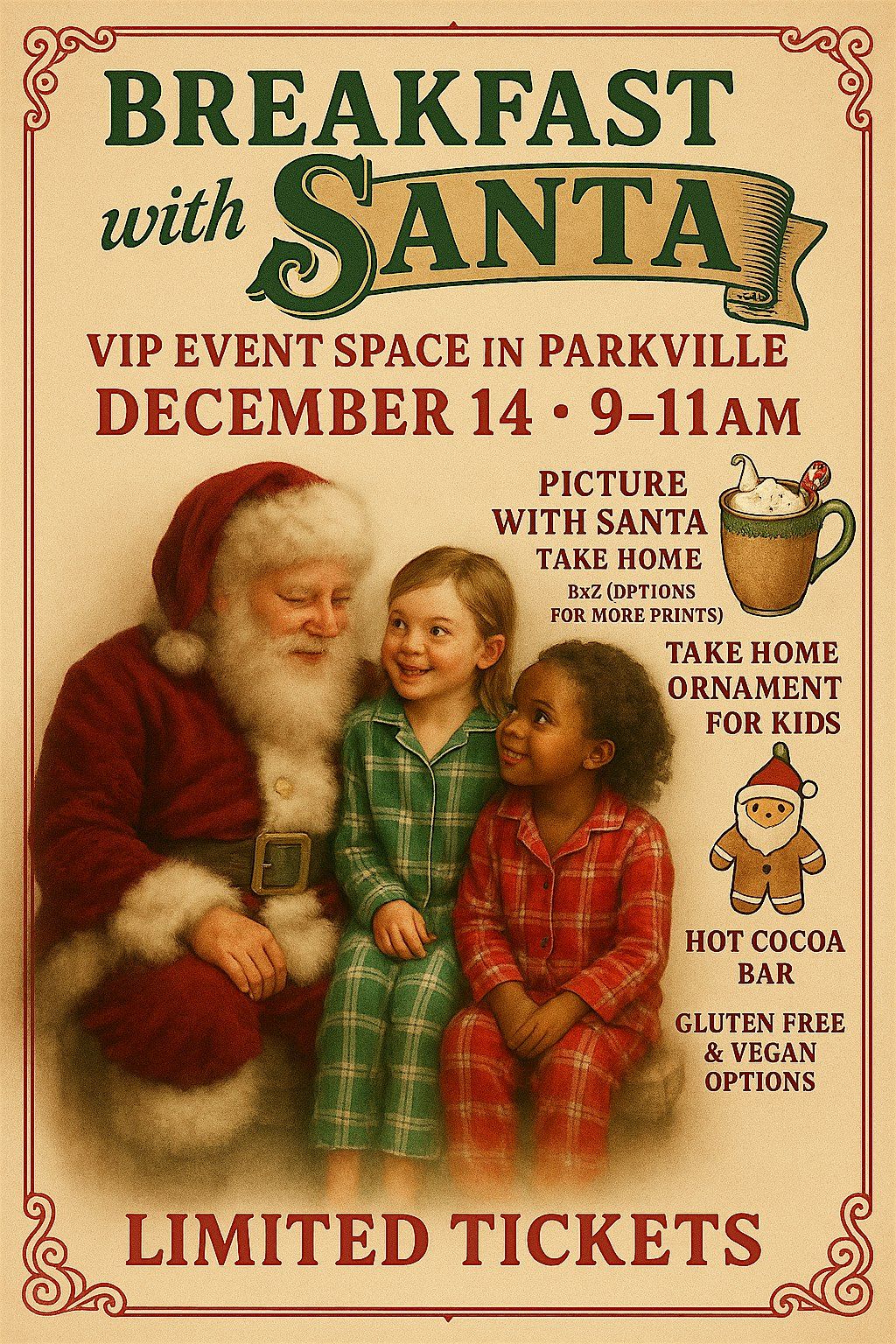 Welcome to Breakfast with Santa at the VIP Special Event Space! Join us on December 14, 2025 at 9:00 AM for a jolly good time. Santa and his helpers will be there to spread holiday cheer and take photos with everyone. Don't miss out on this festive event filled with delicious food, fun activities, and of course, the chance to meet Santa Claus himself. Get ready to make unforgettable memories with your loved ones! See you there! (Central Time)