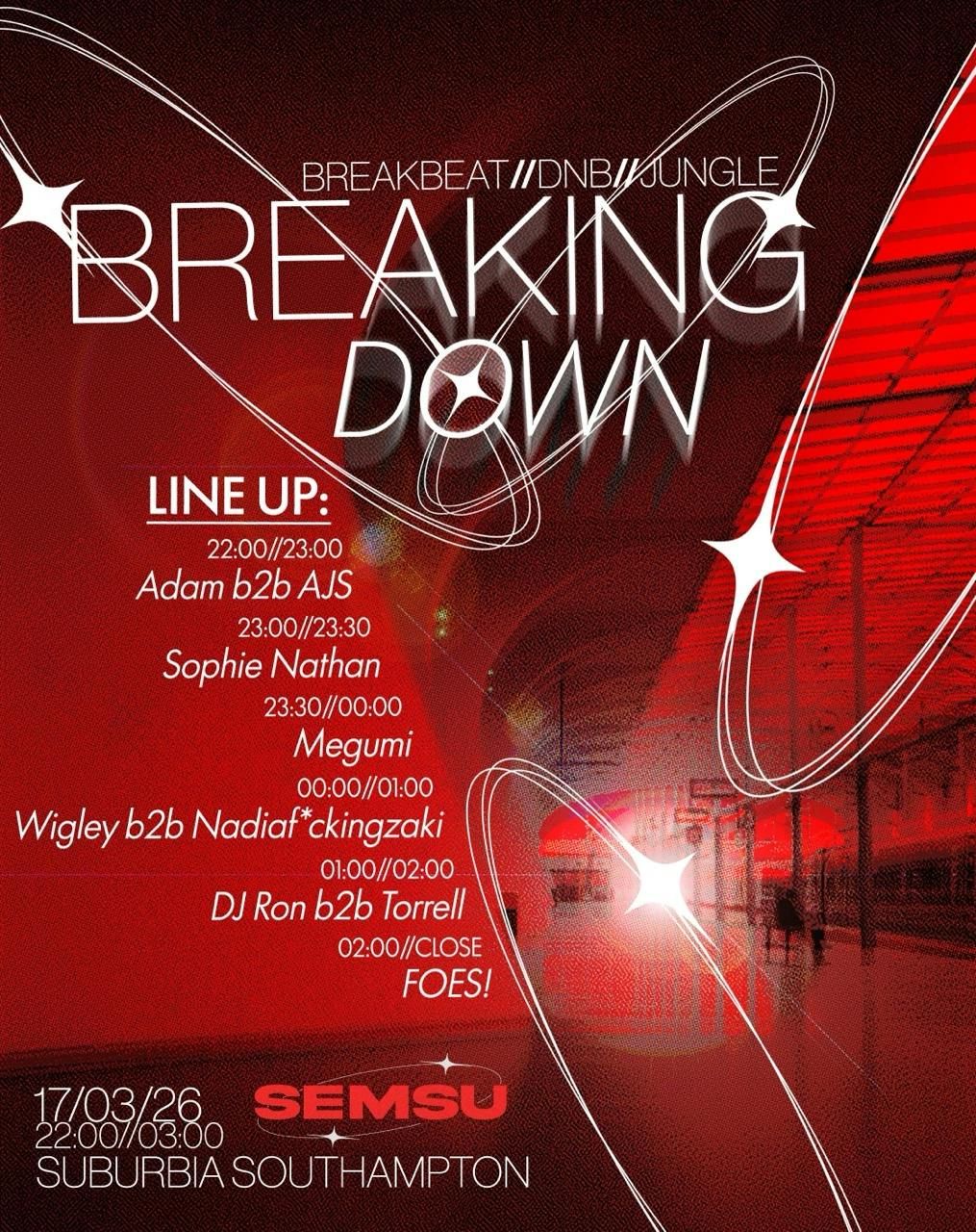 SEMSU presents Breaking Down our first night dedicated to the junglists, DNB heads, and breakbeat lovers.We’re taking over Suburbia, Southampton, for a full night of Breakbeat, Drum & Bass, and Jungle, running from 10PM through to 3AM.