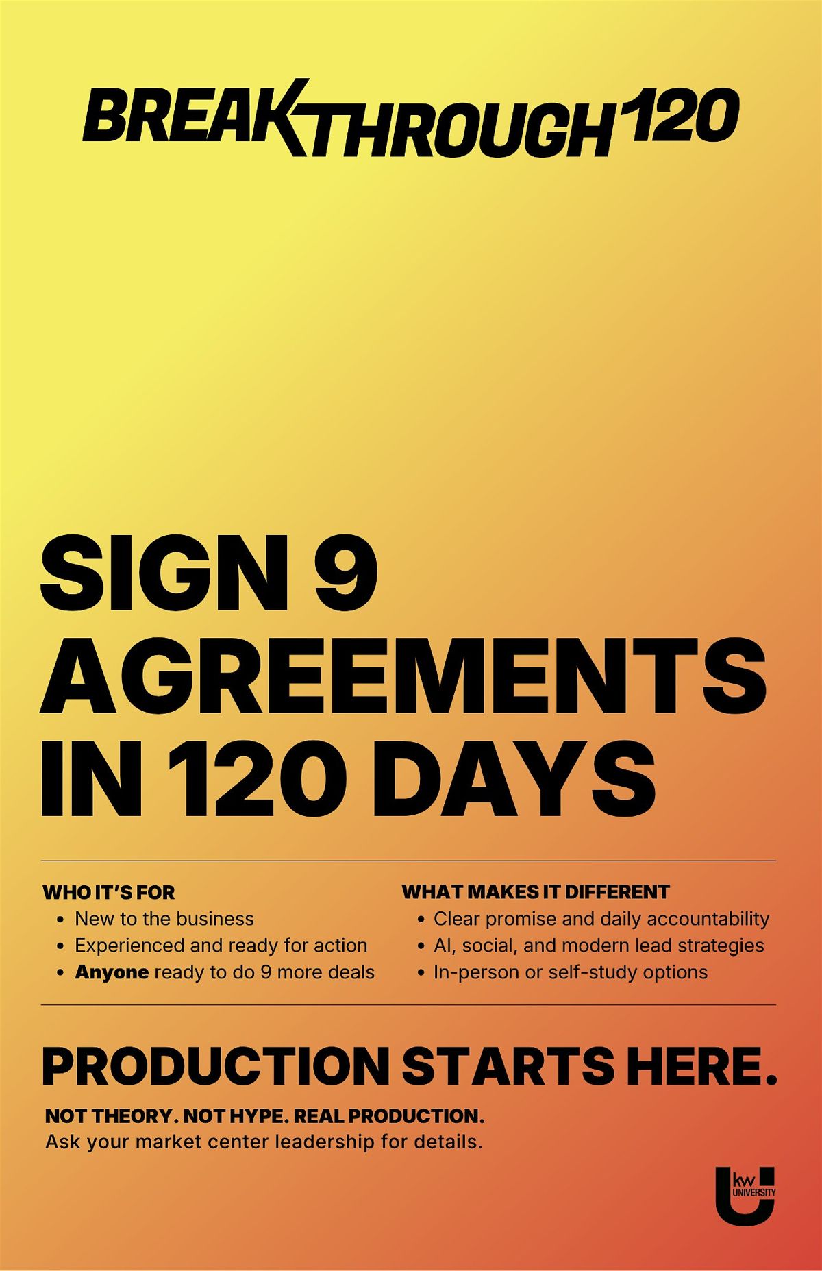 Agents who complete Part 1 graduate into Breakthrough 120 Part 2: The Practice, a 120-day phase focused on daily lead generation, accountability, market expertise, and consistent execution. The goal of Part 2 is to have 5 conversations every day for 120 days, to create 9 signed agreements in your pipeline!