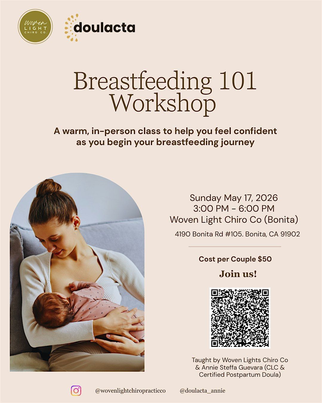 That’s why Woven Light’s pediatric chiropractic team and Certified Lactation Counselor & Postpartum Doula, Annie Steffa Guevara, are teaming up to guide South Bay families through the early postpartum period with compassion, clarity, and hands-on support.