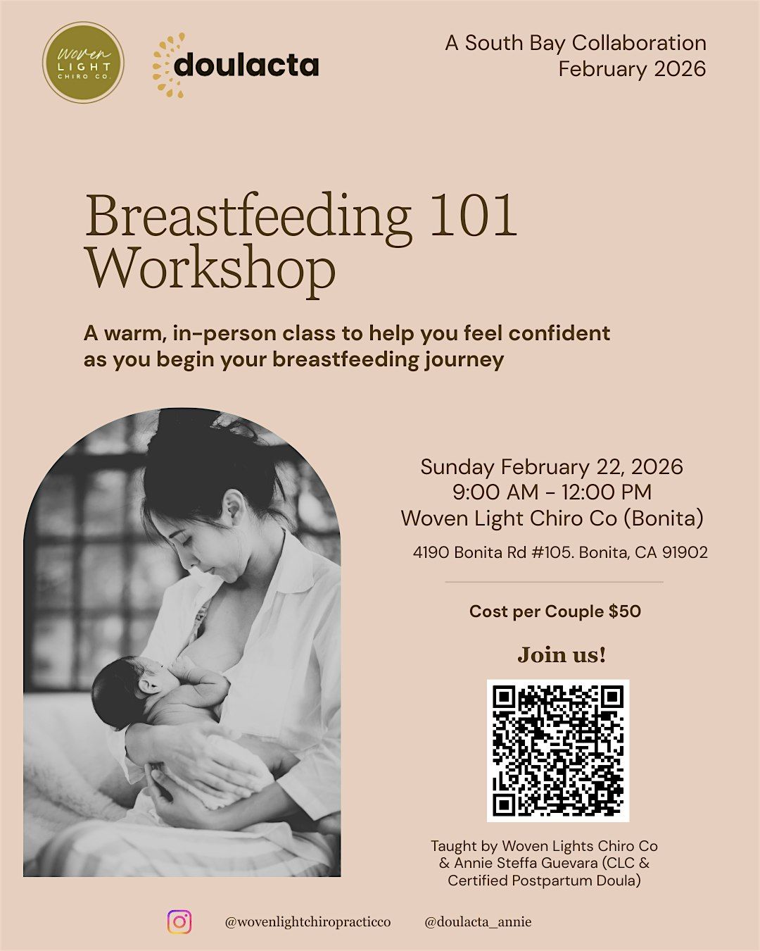 That’s why Woven Light’s pediatric chiropractic team and Certified Lactation Counselor & Postpartum Doula, Annie Steffa Guevara, are teaming up to guide South Bay families through the early postpartum period with compassion, clarity, and hands-on support.