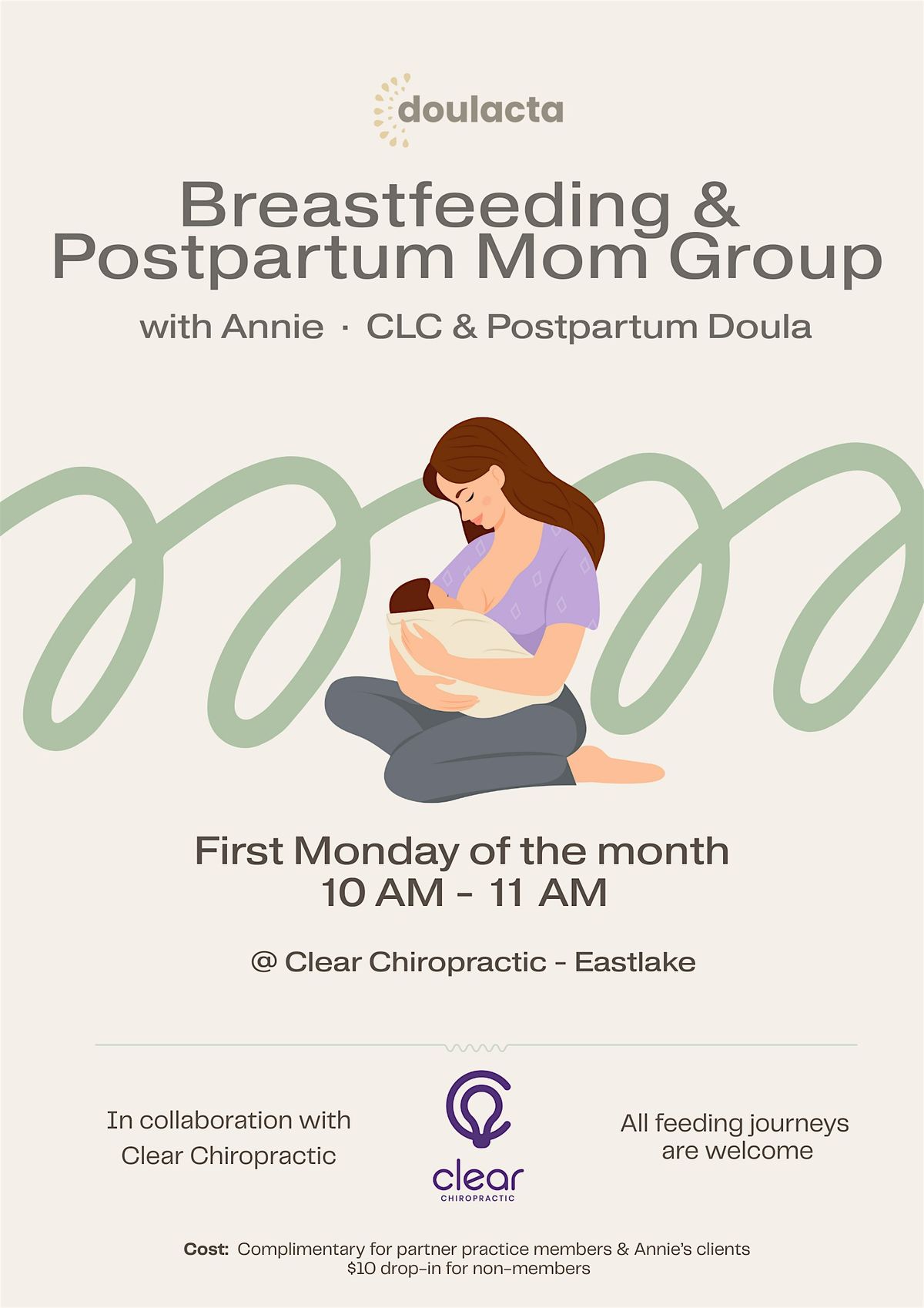 A relaxed, supportive postpartum group for new moms and parents with babies, led by Annie, a certified lactation counselor and certified postpartum doula (and mom).