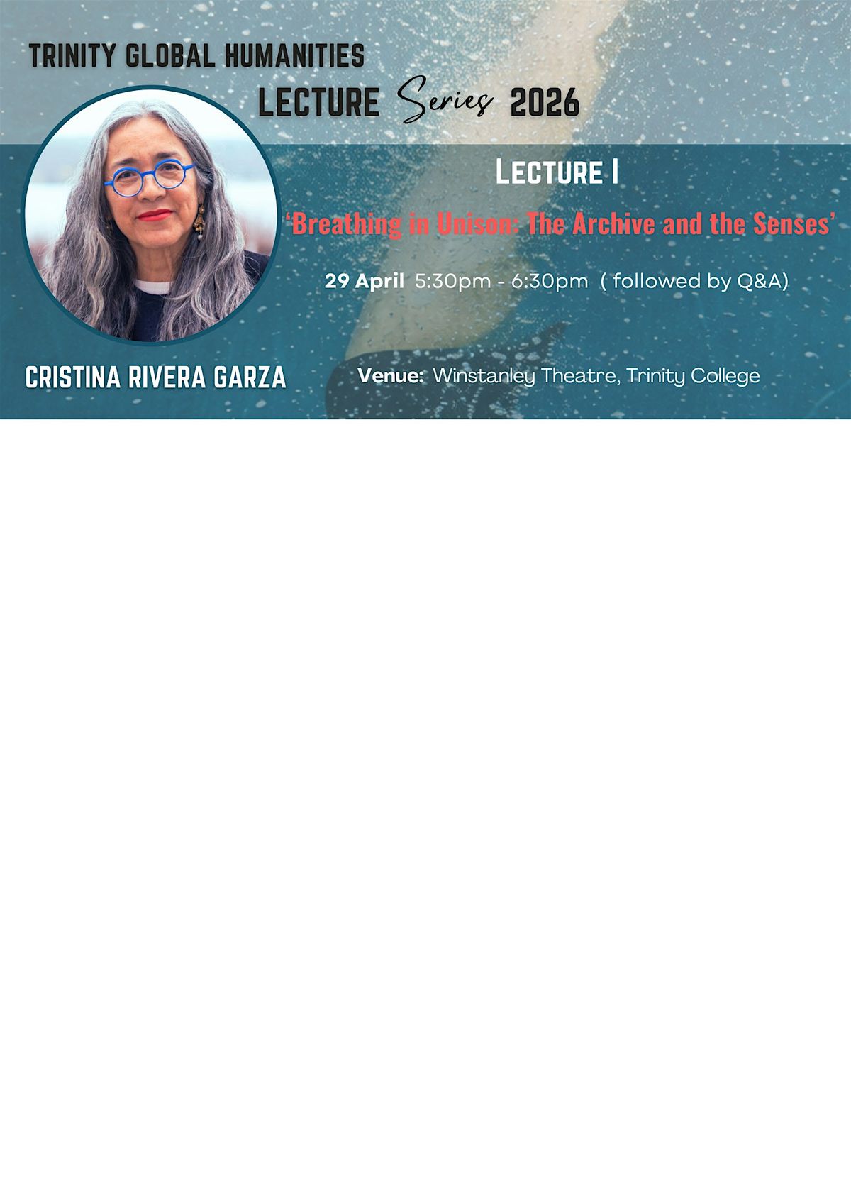 Join us for the Trinity Global Humanities Lecture Series 2026: Tactile: Archives, Collective Memory and Bodies, featuring Pulitzer Prize–winning author, translator, critic, and MacArthur Fellow Cristina Rivera Garza.