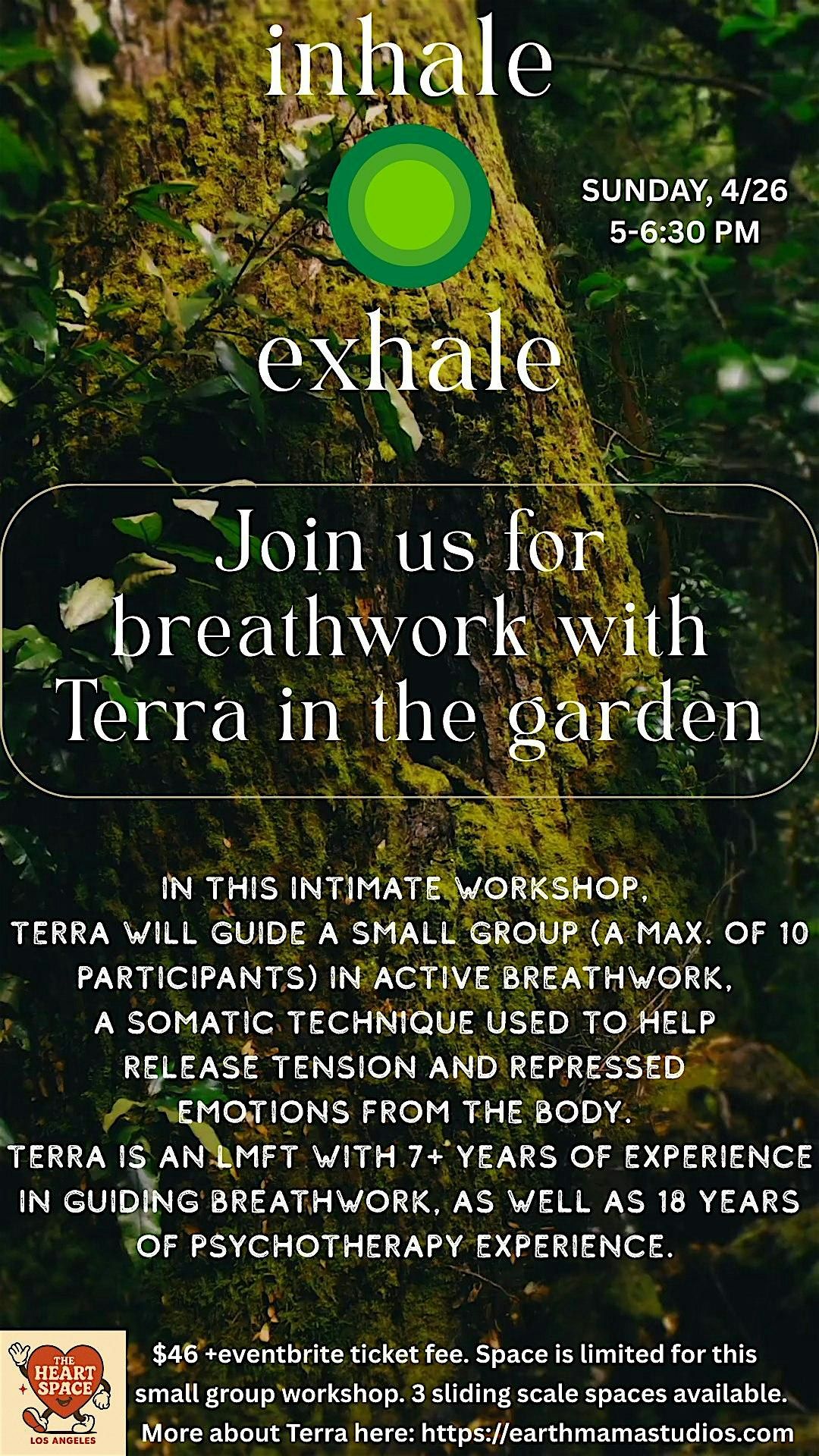 In this intimate workshop, Terra will guide a small group (a max. of 10 participants) in active breathwork, a somatic technique used to help release tension and repressed emotions from the body. Terra is an LMFT with 7+ years of experience in guiding breathwork, as well as 18 years of psychotherapy experience.