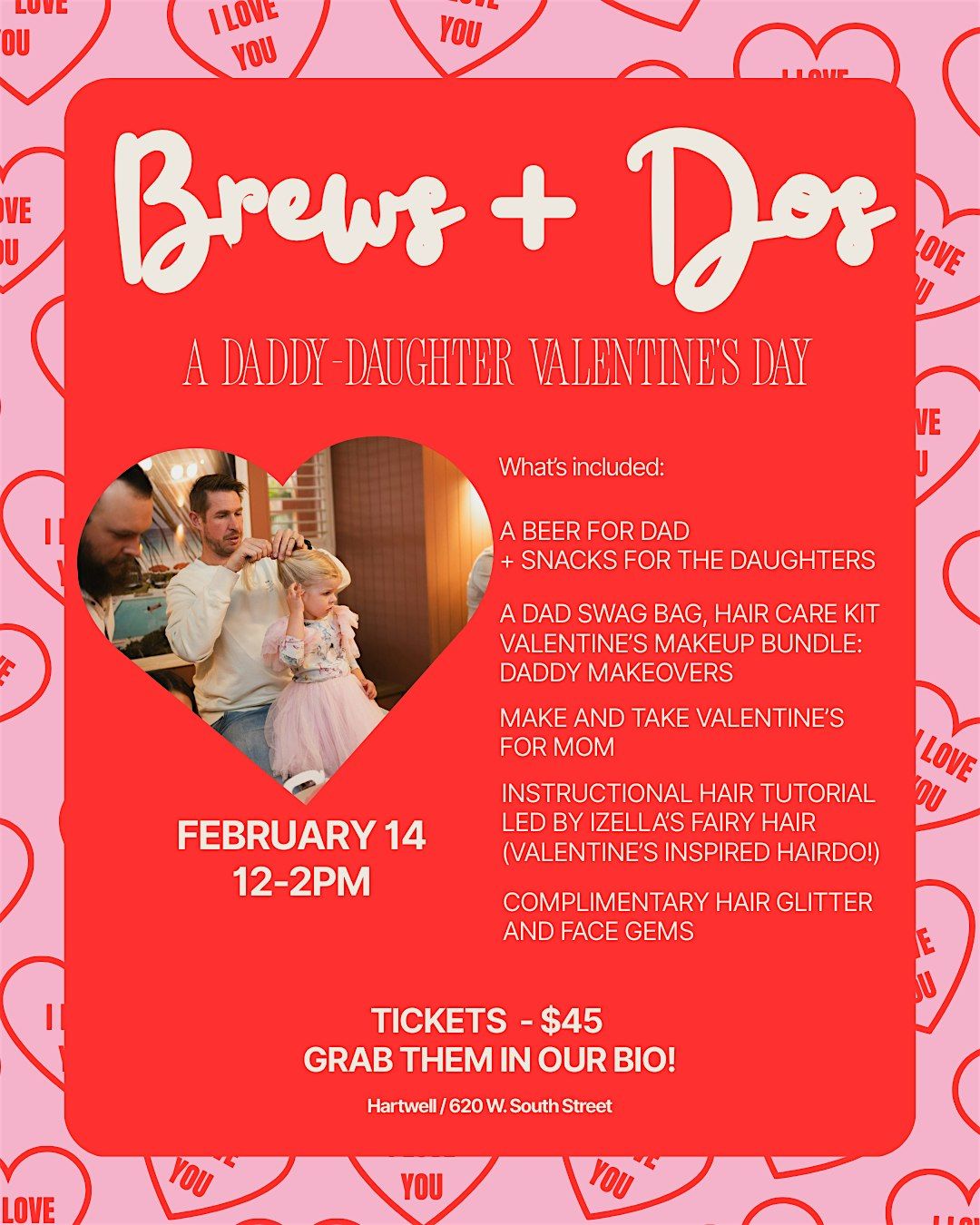 Get ready for an unforgettable in-person day filled with laughs, love, and quality time! Brews and Dos is the perfect way for dads and daughters to celebrate Valentine's Day together. Join us for an afternoon with Izella's fairy hair where Dad can learn a new hairstyle for the best girl in his life. Dad will enjoy a complimentary beer while snacks will be provided the daughters. Stick around for make and take Valentine's for Mom or someone speicial.Don’t miss out on this special chance to bond and make the day extra sweet!