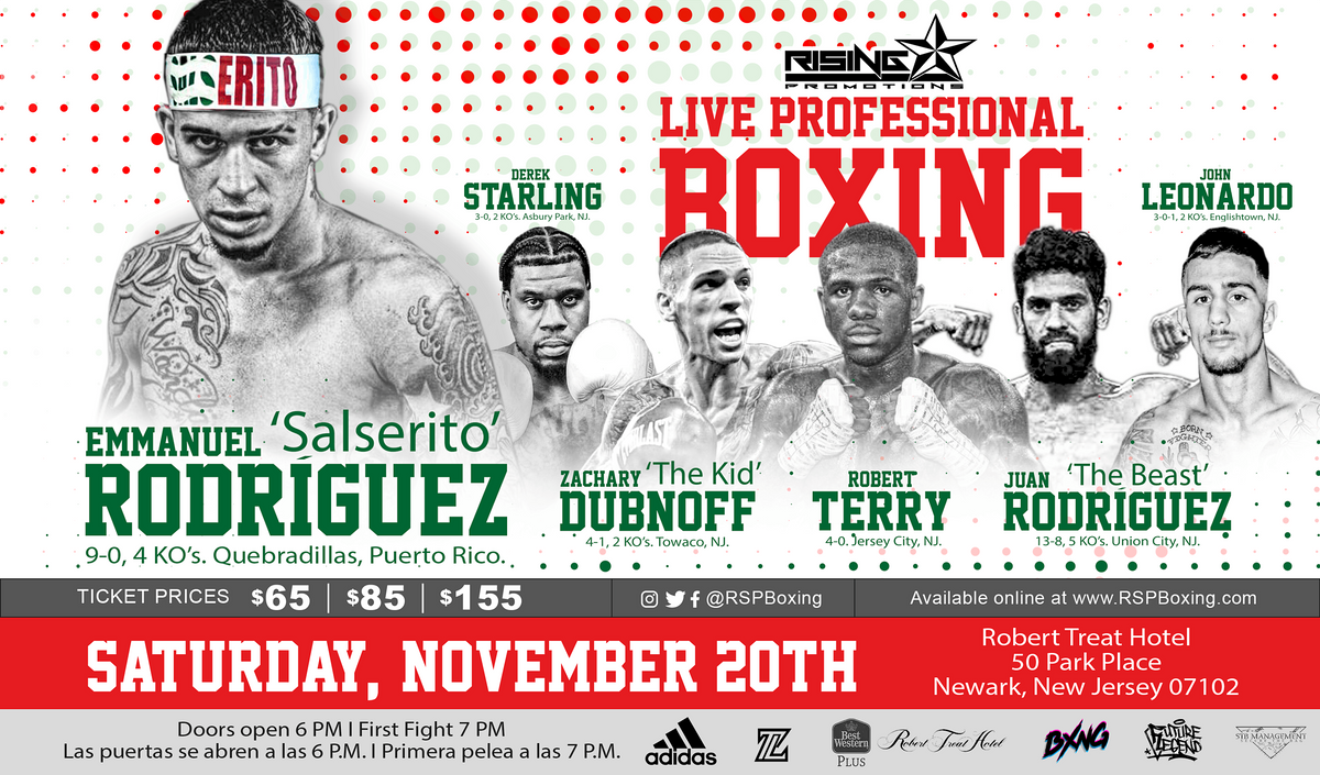 Emmanuel "Salserito" Rodriguez 9-0 4KOs of Newark, New Jersey by way of Quebradillas, Puerto Rico takes on Knockout artist Delvin "Gator" McKinley 4-1-1 4KOs of New Orleans, Louisiana in the 8 round Main Event for the vacant National Boxing Association (NBA) Intercontinental Bantamweight Championship on Saturday, November 20th at the historic Robert Treat Hotel in Downtown Newark, New Jersey.