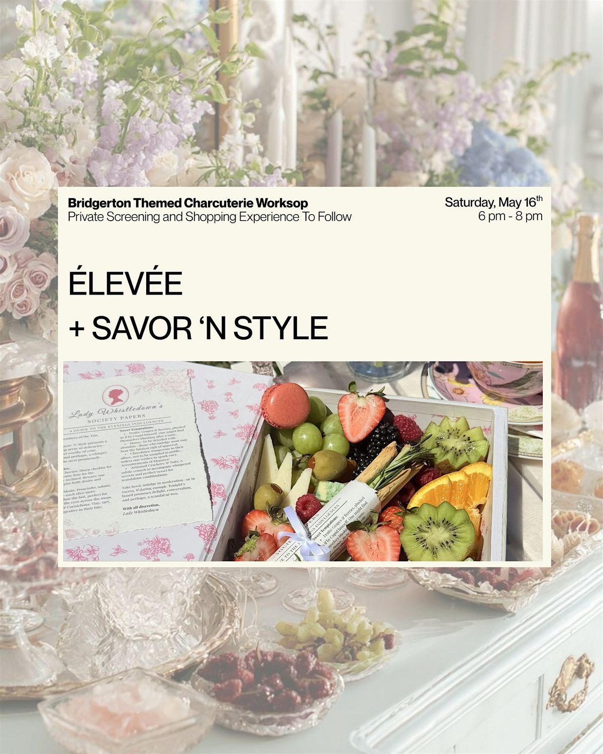You are cordially invited to an enchanting Bridgerton-inspired Charcuterie Workshop at Élevée on May 16th at 6:00 PM.