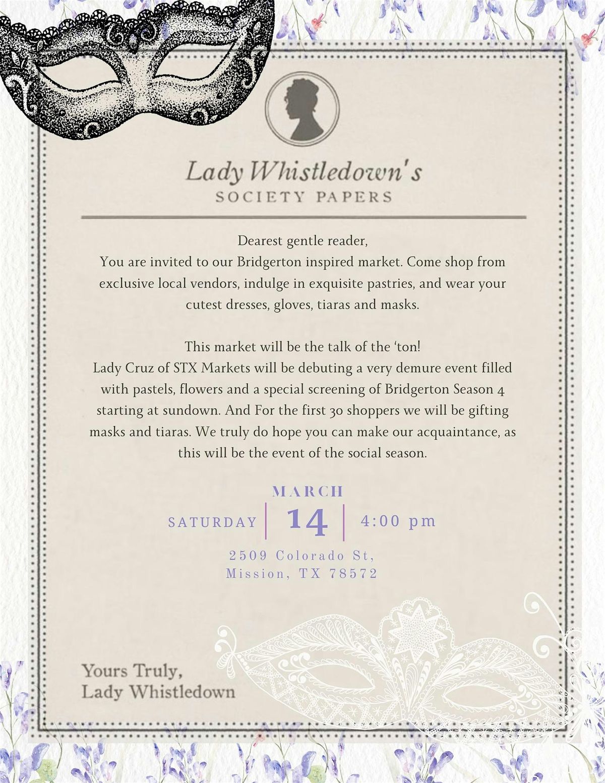 You are cordially invited to an afternoon affair worthy of the ton. Join us for a tea party inspired market where elegance, indulgence, and local charm take center stage.
