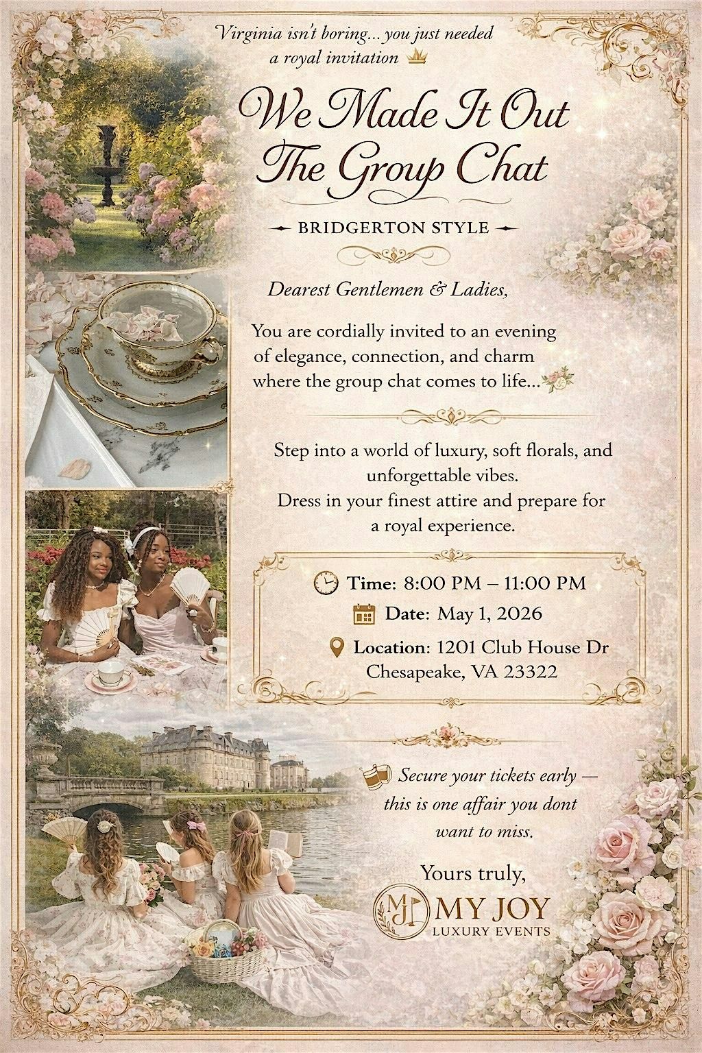 You are cordially invited to an enchanting evening where online connections step beyond the group chat and into real life Bridgerton style. 💐