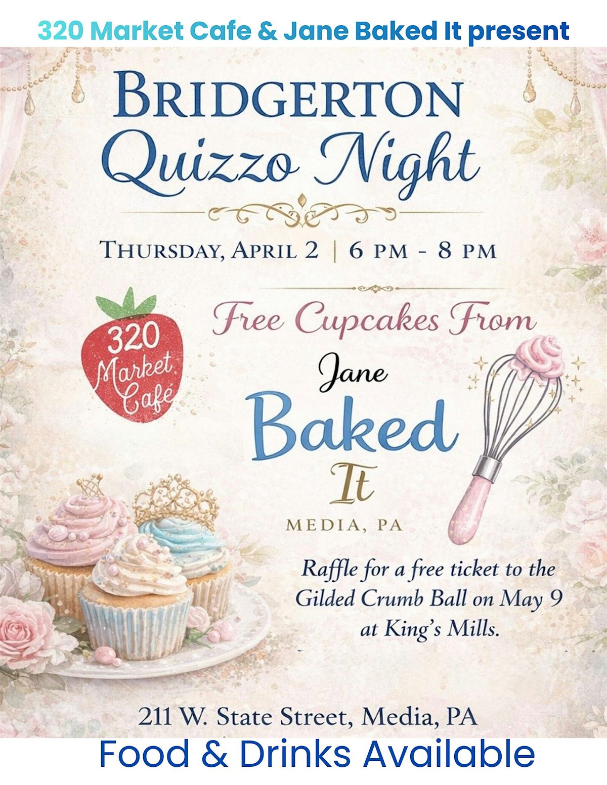 Get ready to test your knowledge of all things Bridgerton in our fun, in-person quiz night! Bring your friends, enjoy some laughs, and put your wits to the test. Plus, there’s a grand prize raffle for a FREE ticket to the May 9th event at Kings Mills...THE GILDED CRUMB BALL. Whether you're a die-hard fan or just love a good challenge, this is the event for you. Don’t miss out on an evening full of excitement and drama—Bridgerton style! Free cupcakes courtesy of Media's own Jane Baked It