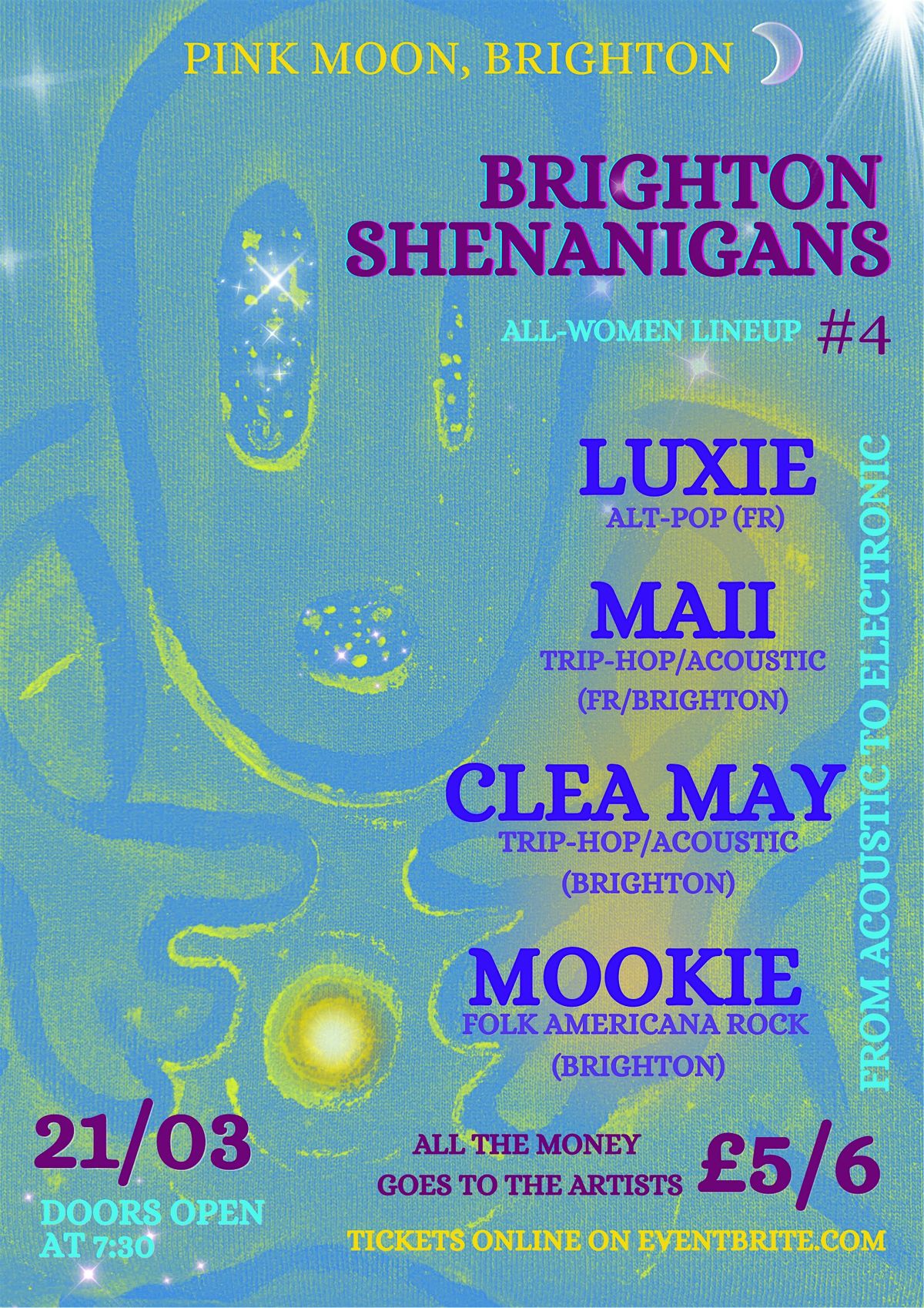 We’ll start with Mookie’s folk americana, dive into the dreamy trip-hop of Maii, continue with Clea May’s hypnotic vibes, and finally close the night with Luxie’s electronic rhythms — taking you from a moving atmosphere to moving bodies!