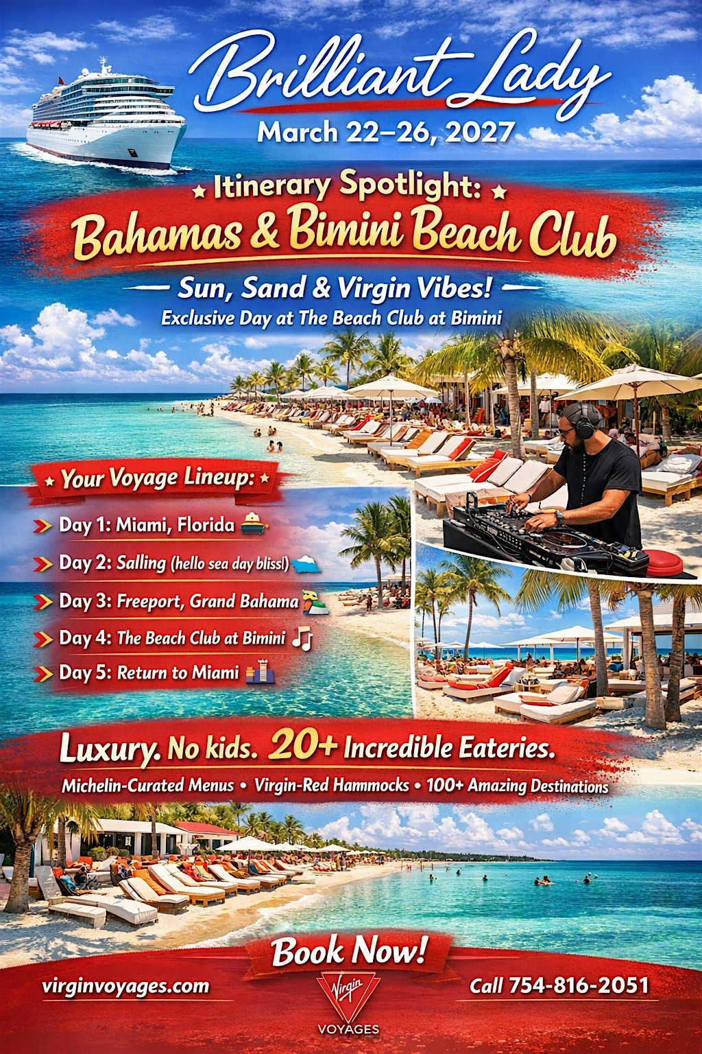 A 4-night adults-only Bahamas escape aboard the Brilliant Lady featuring sea day relaxation, Grand Bahama, and the exclusive Beach Club at Bimini.
