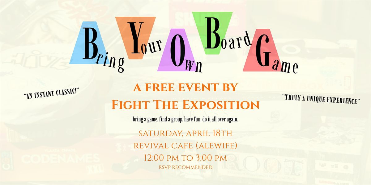 Fight The Exposition presents Bring Your Own Board Game (BYOBG), an event where YOU get to bring a board game to share with other people! Don't have any games? No problem! You are more than welcome to attend as a player.