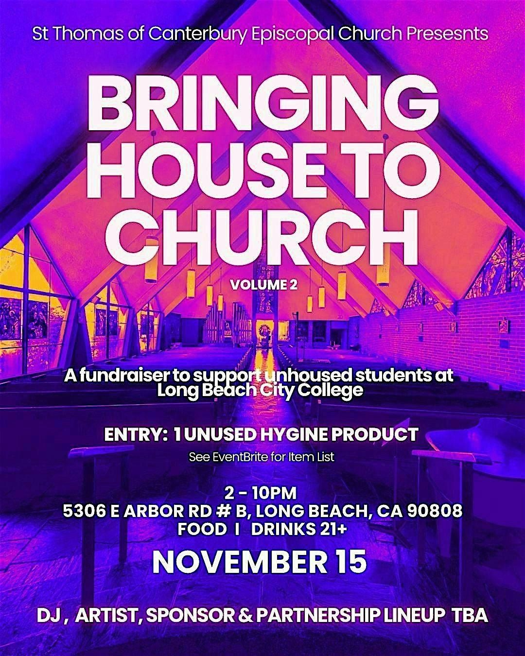 Bringing House to Church: Volume 2 continues our mission of merging music, art, and purpose. This event transforms the sacred space of St. Thomas of Canterbury Episcopal Church into a house music celebration for a cause, raising awareness and support for unhoused students at Long Beach City College.