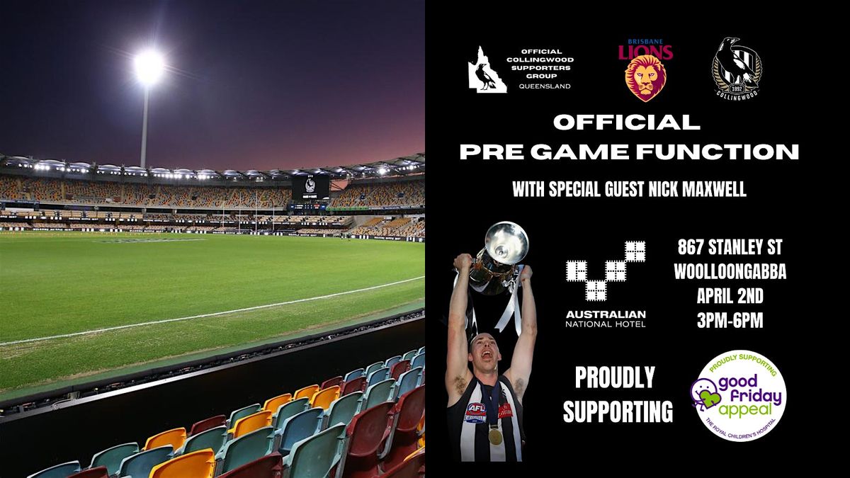 The Official Collingwood Supporters Group QLD welcome all Pies fans to our pre game function on Thursday April 2 2026 at the Australian Natinal Hotel, Woolloongabba.
