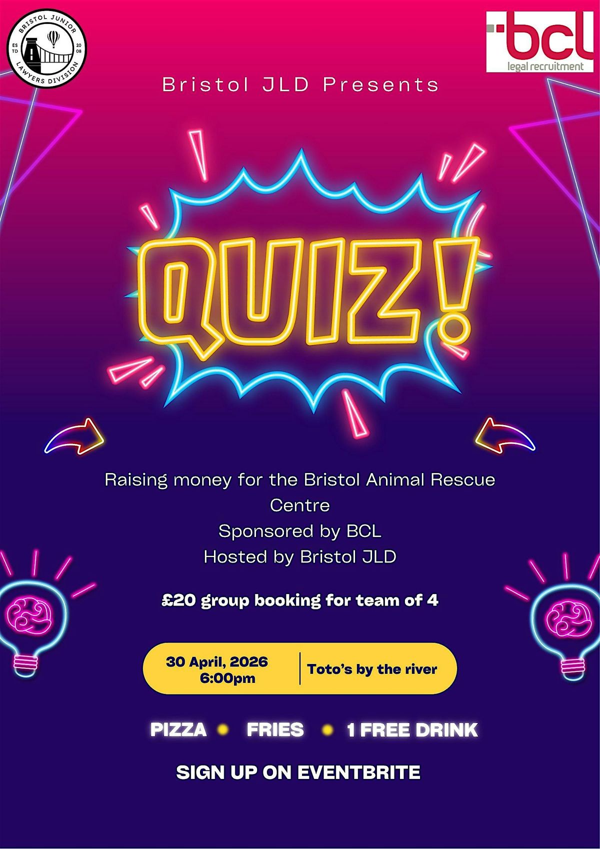 Get ready for a fun night at Totos By The River! Join us on April 30, 2026 at 6:00 PM for the Bristol JLD Pub Quiz. Bring your colleagues, test your trivia skills, and enjoy a relaxed evening with great company and good vibes. Whether you’re a quiz pro or just in it for laughs, this is the place to be. Don’t miss out!