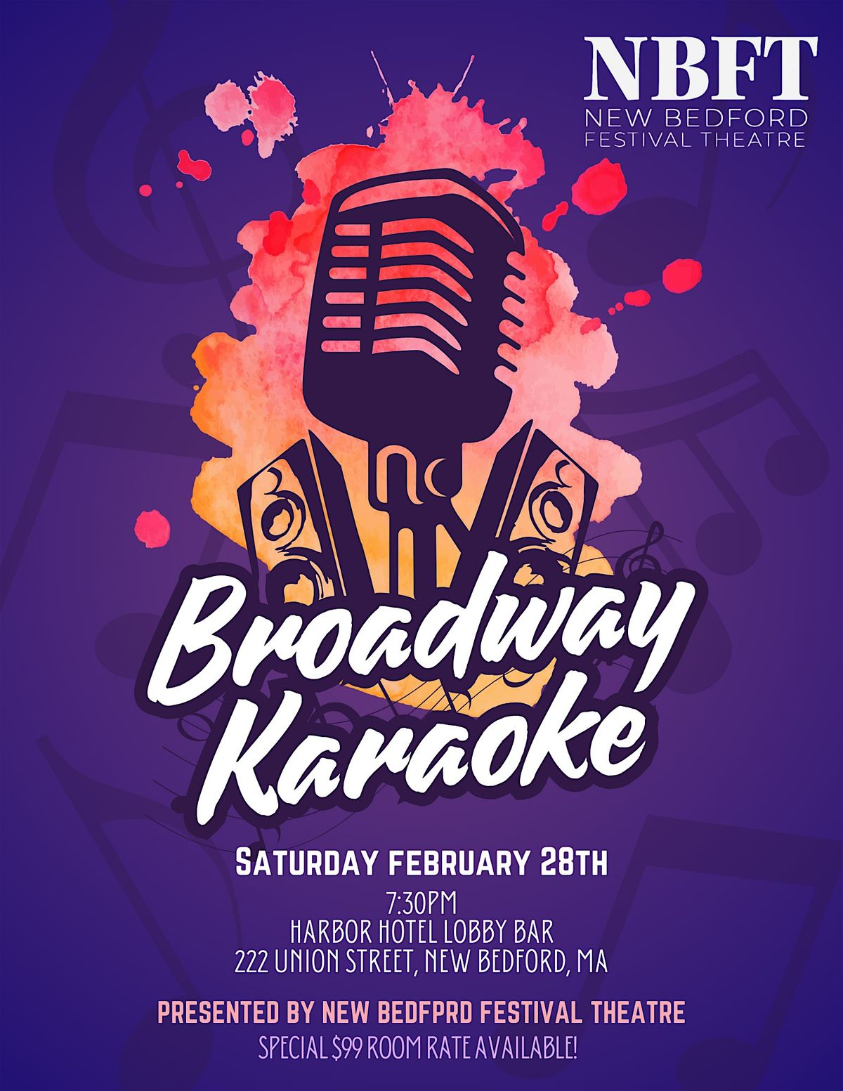 Broadway Karaoke is a free one-night only community event on Saturday, February 28 at 7:30 pm at the New Bedford Harbor Hotel, hosted by the South Coast’s premiere professional musical theatre company, New Bedford Festival Theatre with no cover charge! Led by Broadway’s own South Coast resident Matt Ban (Dennis Dupree in Rock of Ages on Broadway), expect an amazing night belting out your favorite Broadway tunes!