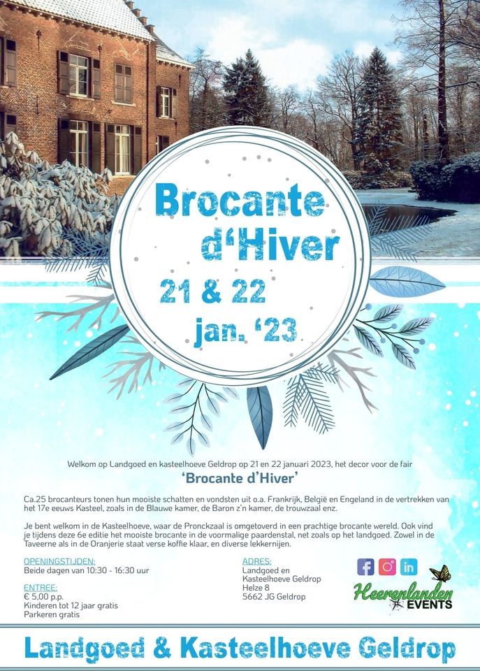 Welkom op Landgoed en kasteelhoeve Geldrop op 21 en 22 januari 2023, het decor voor de fair “Brocante d’Hiver”.Ca.25 brocanteurs tonen hun mooiste schatten en vondsten uit o.a. Frankrijk, België en Engeland in de vertrekken van het 17e eeuws Kasteel, zoals in de Blauwe kamer, de Baron z’n kamer, de trouwzaal enz.