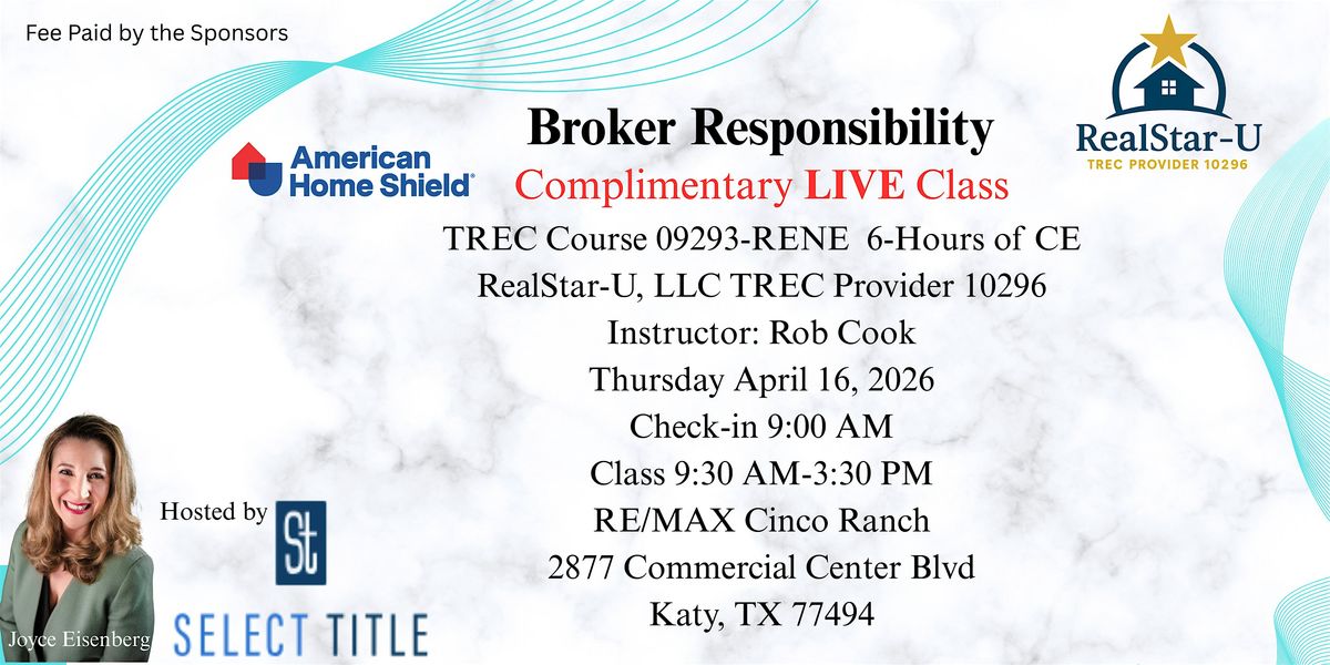 Broker Responsibility TREC Course 09293-RENE This is a required 6-hour course for all brokers and those license holders who are named as delegated supervisors. This course covers: Introduction, Delegated Supervisors & Teams, Ensuring Competency & Training for Agents, Practical Application Related to Required Documentation, Additional Broker Responsibilities and TREC Enforcement & Broker Responsibility