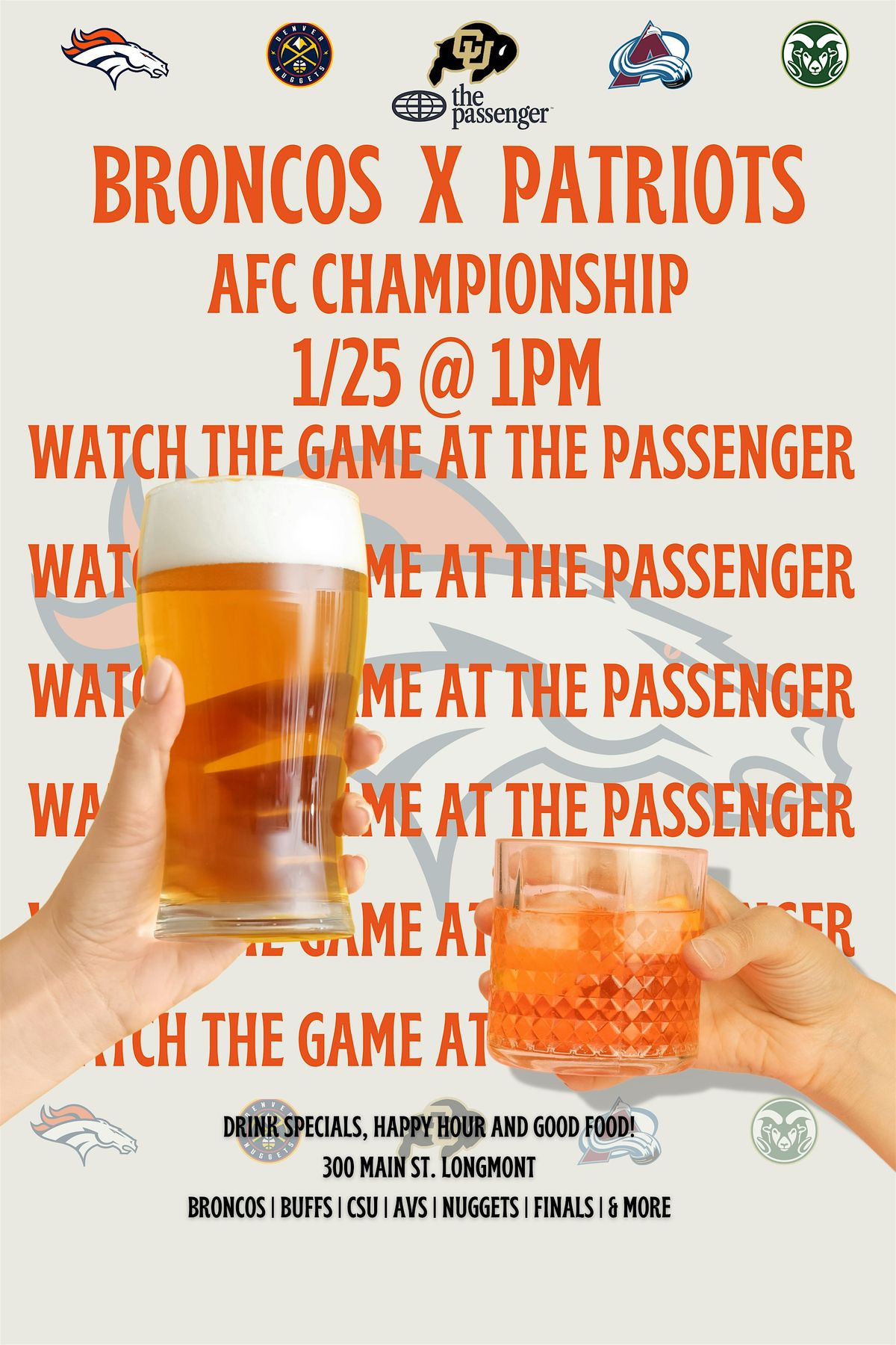 Looking for the best place to watch the Denver Broncos Championship Game in Longmont? Join us this Sunday at 1:00 PM for a high-energy Broncos Watch Party at our bar as we cheer them on toward a Super Bowl appearance.