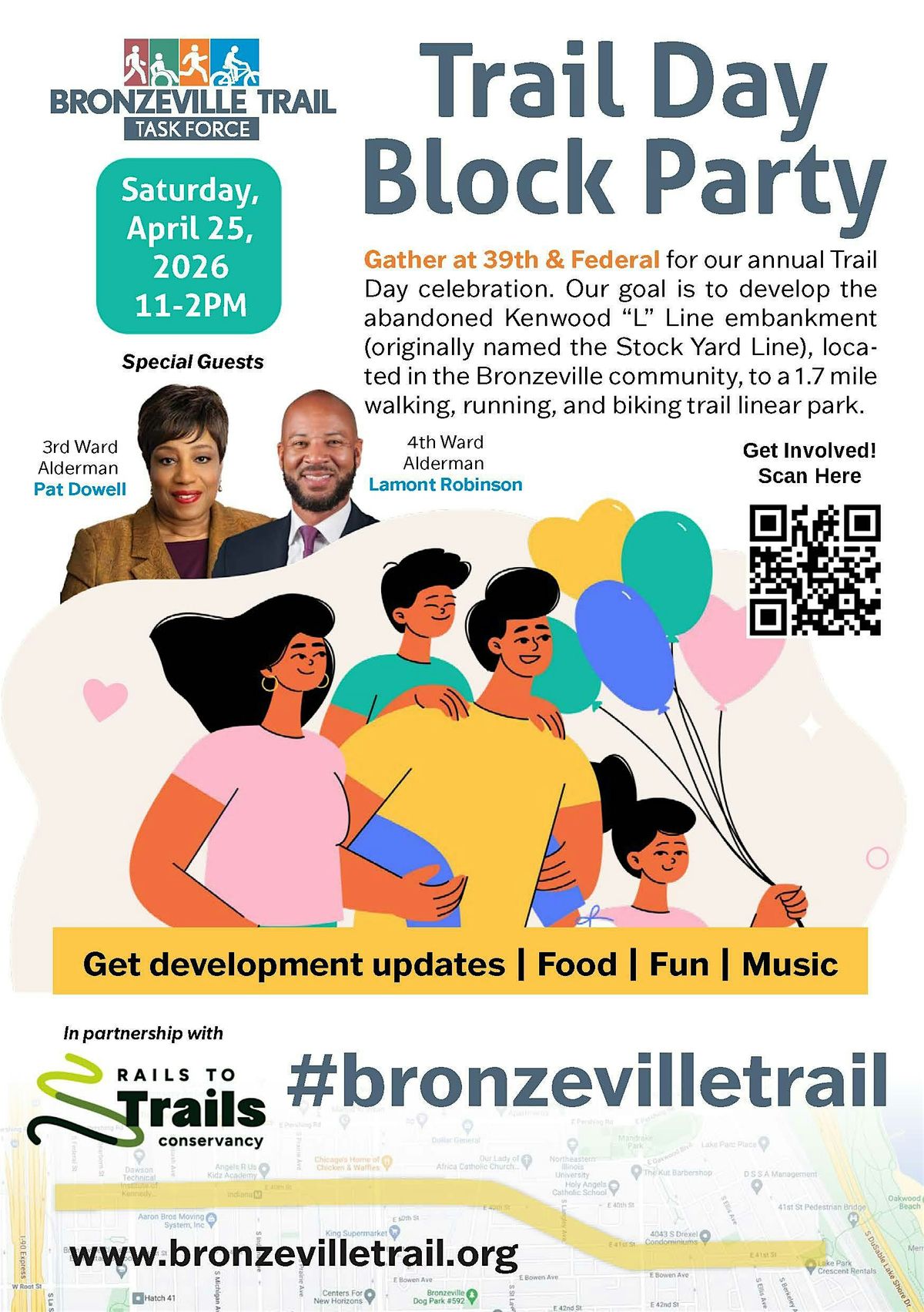 Join the Bronzeville Trail Task Force for a day of family fun and learn about the development of the Bronzeville Trail, transforming the abandoned Kenwood “L” Line embankment (originally named the Stock Yard Line) to a 1.7-mile walking, running, and biking trail linear park.