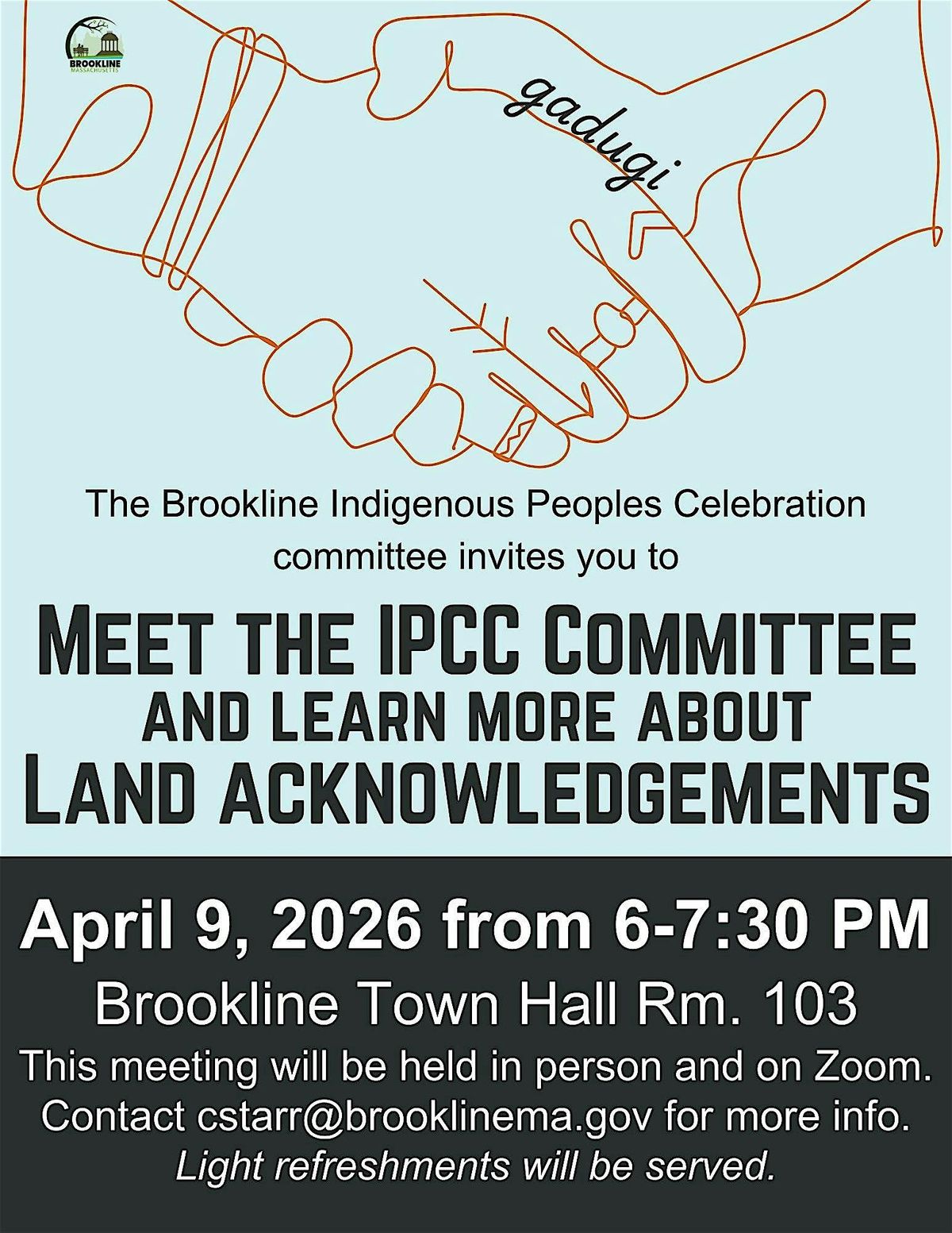How does a Land Acknowledgement reflect history and serve a tribal nation? Brookline's Land Acknowledgement is read at many town official meetings. Does it represent our history? Our community? Brookline Indigenous Peoples Celebration Committee (IPCC) Chair Kailey Bennett (Cherokee Nation) will lead this discussion. This event is also an opportunity to meet the rest of the IPCC and hear about our programming. Light refreshments will be provided. THIS IS A HYBRID EVENT. We will be at Brookline Town Hall Room 103 and also on Zoom. FOR A ZOOM LINK PLEASE CONTACT [email protected]. See you there!