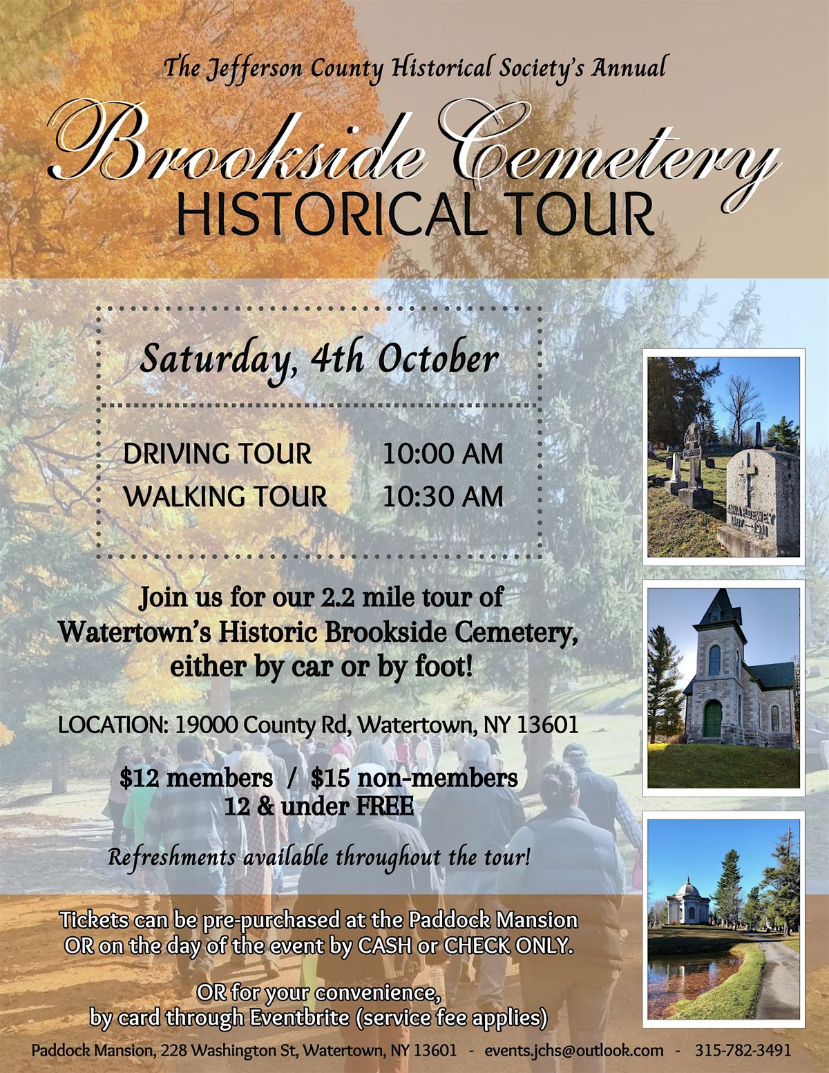 Join us for our 2.2 mile tour of Watertown’s Historic Brookside Cemetery, either by car or by foot on Saturday October 4th!About this Event
