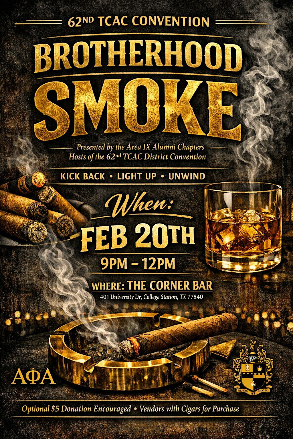 Join brothers from across Texas for an evening of fellowship, conversation, and relaxation at the Brotherhood Smoke, an official late-night gathering during the 62nd TCAC District Convention.
