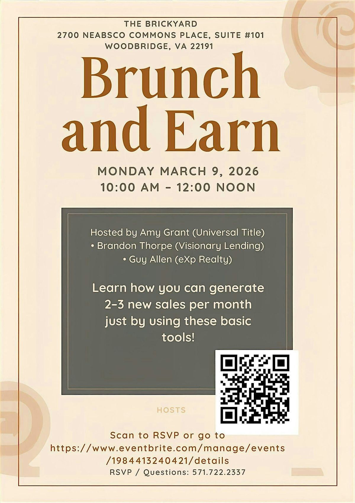 You want more business? Dont want to spend thousands of dollars trying to find out what works? Join us for our "Brunch and Earn" events and get the inside scoop on the right tools for your business. Meet with the experts, Amy Needam of Universal Title, Brandon Thorpe of Visionary Lending and Guy Allen of eXp Realty. Space is limited so register early Brunch is included.