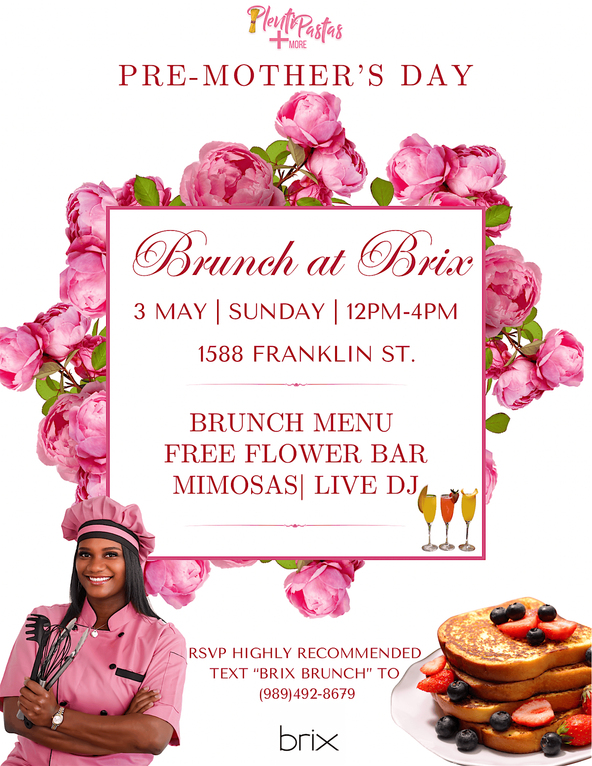 An Expertly Curated Brunch Food Experience hosted monthly by Chef Shinia at Brix Wine on May 3, 2026 at 12:00 PM (Eastern Daylight Time). It's the perfect Pre-Mothers Day Event to enjoy with family & friends!