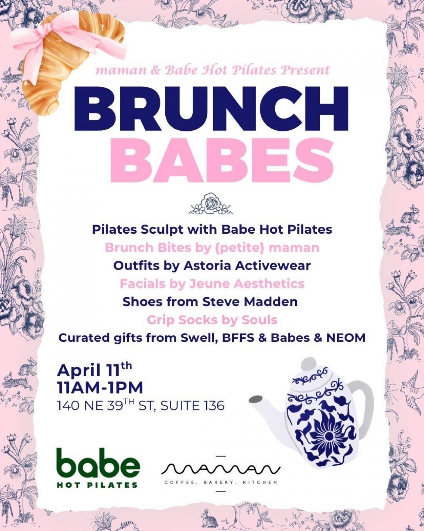 Join us for a Pilates Sculpt class with Babe Hot Pilates followed by brunch bites from maman. Sponsored items will be available from Astoria Activewear, Facials by Jeune Aesthetics, shoes from Steve Madden, grip socks from Souls as well as curated gifts from S'well, BFFs & Babes and Neom.