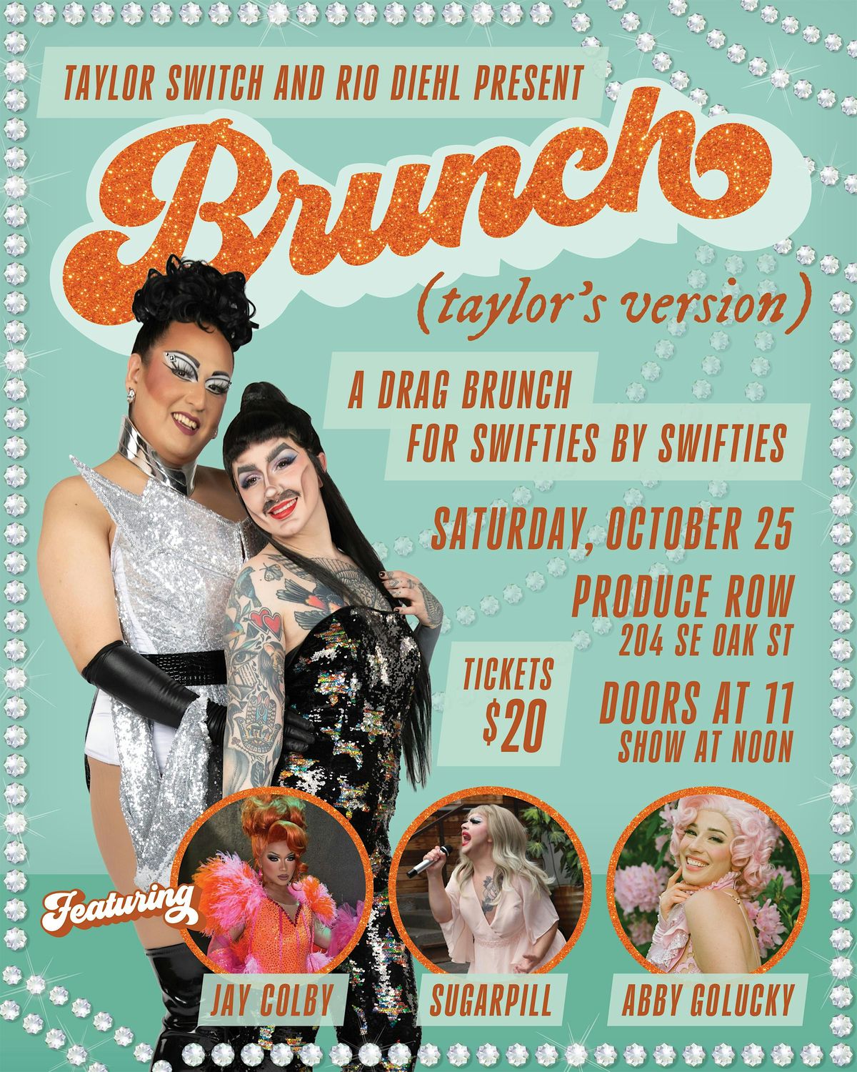 Join hosts Taylor Switch and Rio Diehl Volt for a Swiftie drag brunch that celebrates the sparkle, sass, and glamour of showgirl life. Expect glittering costumes, high-energy performances, and Taylor Swift hits both new and old reimagined with drag, burlesque, and cabaret flair. This is your chance to sip mimosas, sing along, and live your best showgirl fantasy — all in one unforgettable brunch experience!