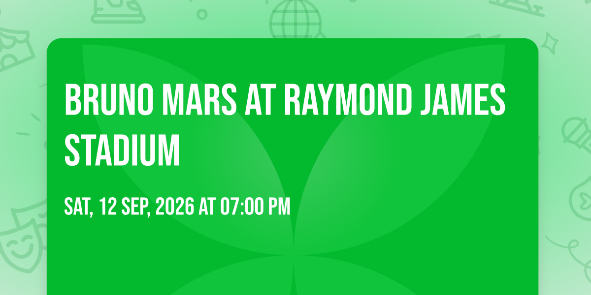 ✨ Embark on an extraordinary journey at Bruno Mars at Raymond James Stadium, where every moment promises to be unforgettable! 🌟 Imagine of transforming Raymond James Stadium in the heart of Tampa, FL into a realm of endless possibilities. 📅 Join us on September 13th, 2026 at 07:00 PM for an experience that will challenge your imagination and exceed your expectations. 🎯 This carefully curated event combines the finest elements of entertainment, innovation, and community spirit. Whether you're an adventure seeker, culture enthusiast, or someone looking for unique experiences, this event offers something special for everyone. 🎊 Don't miss this chance to be part of something extraordinary!