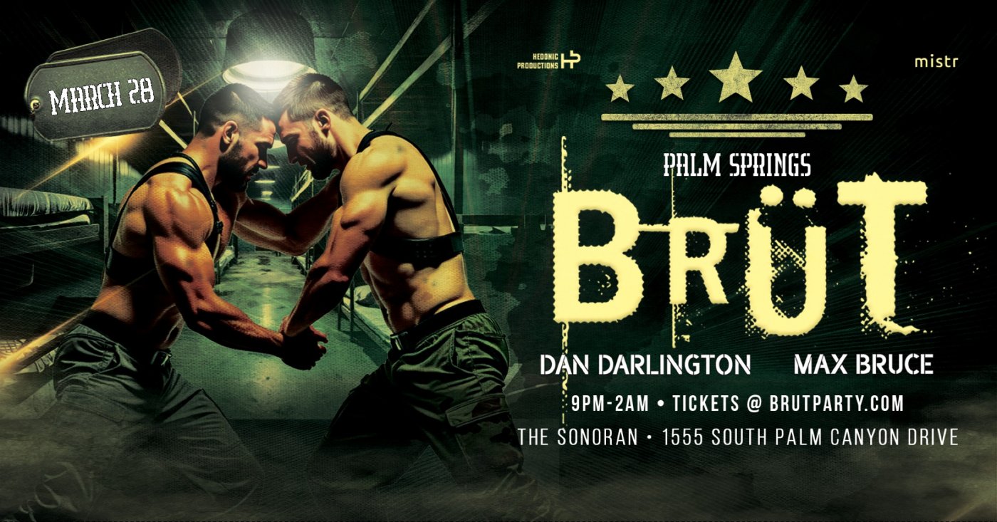Raw force and controlled chaos collide in Palm Springs. Built on discipline, precision, and momentum, the night activates with commanding bodies, driving rhythms, and a pulse that takes control of the floor fast. The BRÜT Signal is live over gay nightlife in Palm Springs. Gear up, lock in, and fall into formation—we’re lighting the way and calling everyone into active duty for a night of pure insanity and the sexy chaos you only find at the BRÜT Party.