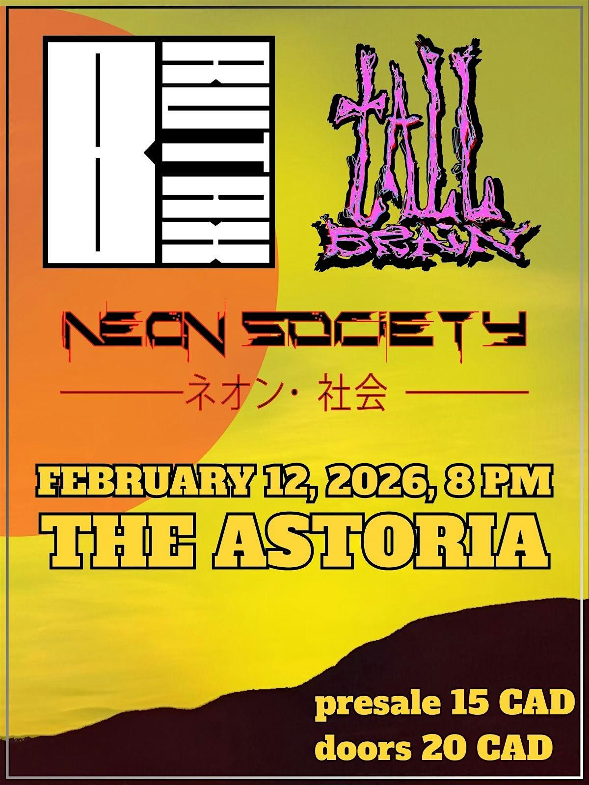 Get ready for an epic night at Astoria Pub with BRUTAX, NEON SOCIETY, and TALL BRAIN hitting the stage live! This is your chance to vibe with some killer tunes and experience the energy of an in-person show. Grab your crew, bring your good vibes, and let's make it a night to remember!