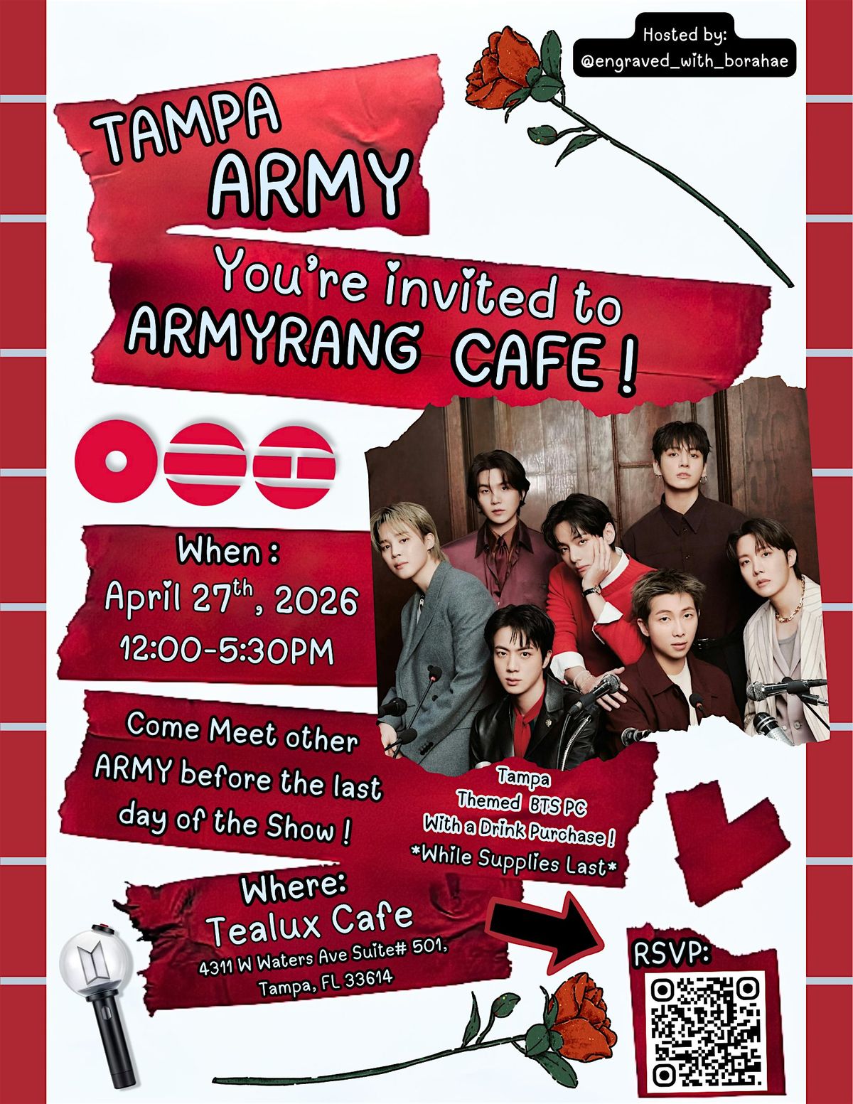 Come enjoy bts music and meet other Army! Collect a Tampa Themed BTS PC with a drink purchase (while supplies last), exchange freebies too!