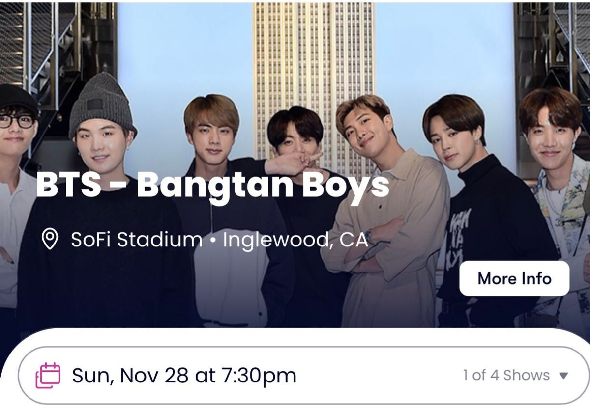 BTS at SoFi Stadium๐ Prepare to be amazed at BTS Inglewood Tickets, the most anticipated gathering of the season! ๐ Set against the stunning backdrop of SoFi Stadium in vibrant Inglewood, CA, this event promises to redefine your expectations. ๐
