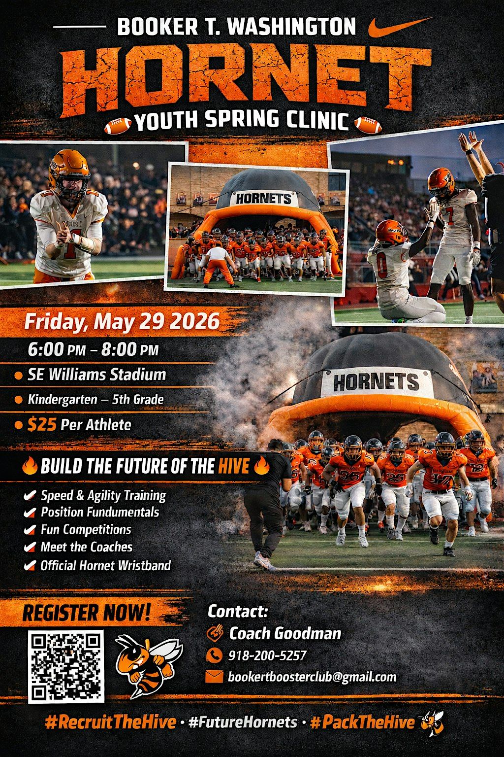Hornet Youth Spring Clinic May 29, 6–8 PM @ SE Williams Stadium. K–5th grade. Train, compete, meet coaches & build the future of the Hive.