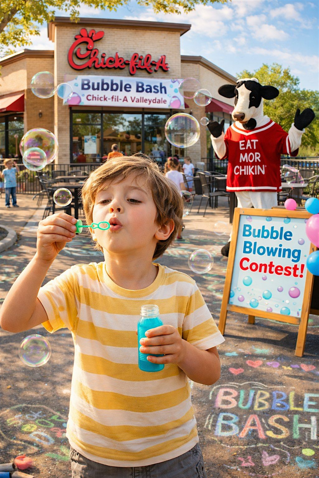 Get ready for a super fun time on the patio at Chick-fil-A Valleydale (5331 Valleydale Rd) on May 19, 2026 at 4:00 PM. We'll have a contest to see who can blow the biggest bubble, the CFA Cow, sidewalk chalk, laughs, and good vibes all around. Bring your friends and let's make some awesome memories together. Don’t miss out on the coolest bash in town!