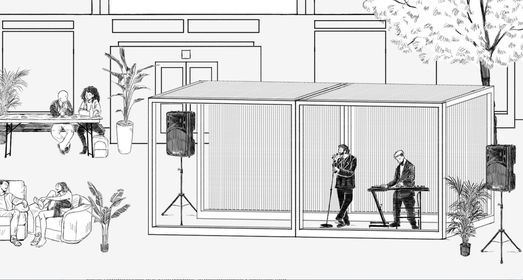 An die Stelle der Schließung setzen wir das Potential und Elan der Anwohner*innen. So wird aus der Supermarktruine ein futuristisches-autonomes Jugendzentrum. Ein installatives Pop-up Wohnzimmer setzt kollektives Beisammensein in den Fokus. Wie vielerorts verbrachten und verbringen die meisten Menschen die Pandemiezeiten, besonders den Lockdown, in den eigenen vier Wänden, im eigenen Wohnzimmer. Die Installation würdigt einerseits die individuellen Strapazen der Menschen und lädt alle Anwohner*innen ein, zumindest für einen Moment, aus ihrem Eigenen herauszutreten und Neues gemeinsam zu bilden.