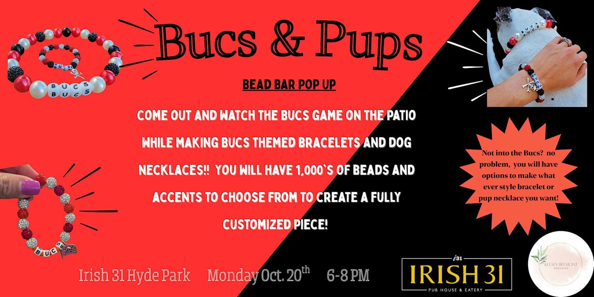 Come join us at Irish 31 Pub Hyde Park for a fun evening of beads, drinks, and furry friends. Join us on Monday October 20th from 6-8pm to watch the Bucs game and create custom Bucs bracelets, a Bucs Pup necklace, or both! There will be 1,000's of beads and different accents to choose from to truly customize your creation!