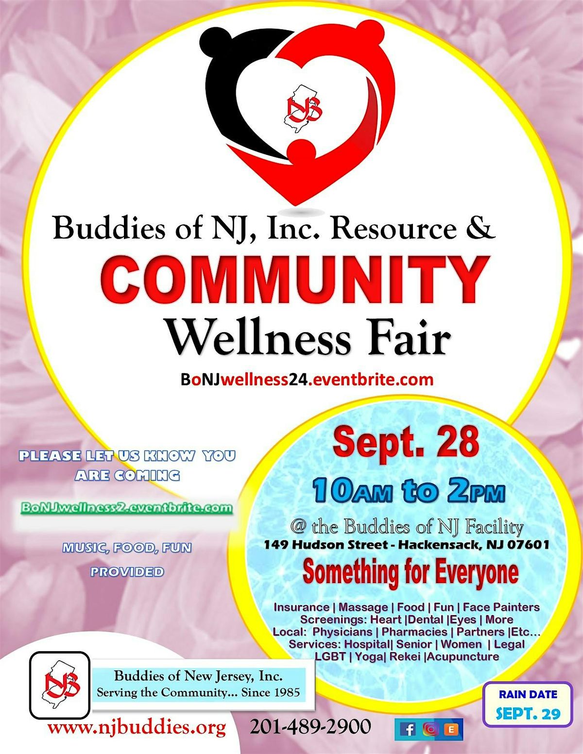 Welcome to the Buddies Resource & COMMUNITY Wellness Fair! Join us for a day filled with valuable resources and activities to promote wellness in our community. The event will take place at 149 Hudson St, where you can connect with local organizations, health professionals, and fellow community members. Explore booths offering information on mental health, nutrition, fitness, and more. Participate in workshops, fitness classes, and interactive demonstrations. Don't miss this opportunity to learn, connect, and prioritize your well-being. See you there!
