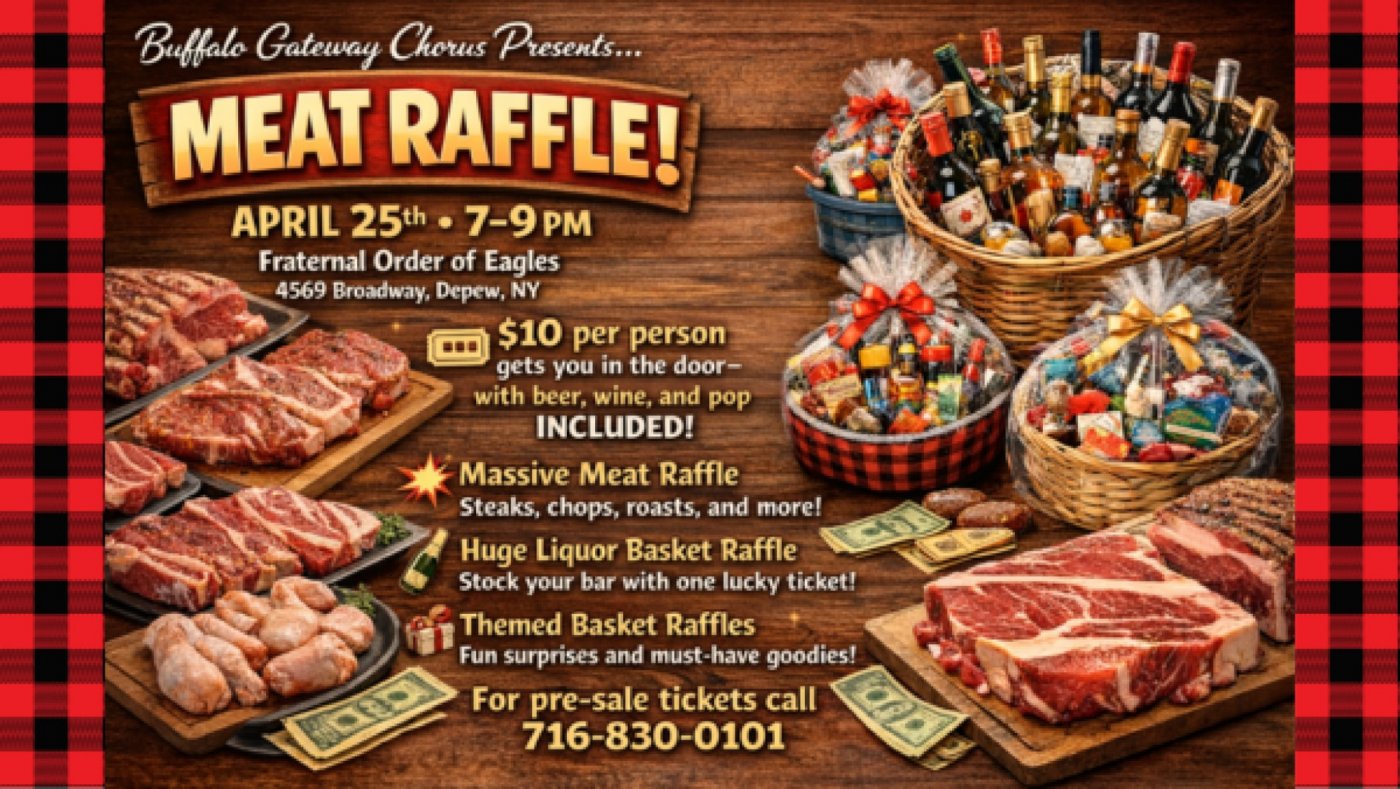 Come have a sizzlin’ good time with the Buffalo Gateway Chorus at our Meat Raffle.