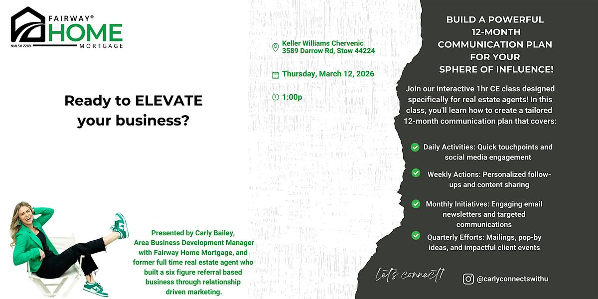 Join our interactive 1 hour CE class designed specifically for real estate agents. You will learn how to build a customized 12 month communication plan that keeps you consistent, visible, and top of mind.