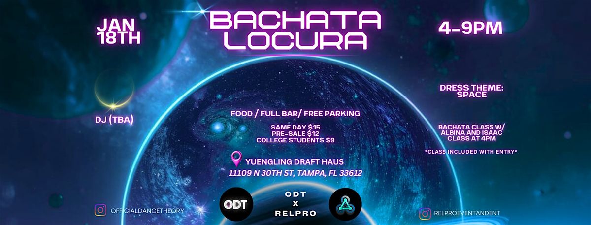 Get ready for an out-of-this-world bachata experience including dance lessons, amazing music and an awesome bar staff to fuel your night of fun! This event will take place at the Yuengling Draft Hause, known for it's flavorful cocktails and delicious food! There is no age restriction for the event, however, they will ID at the bar.