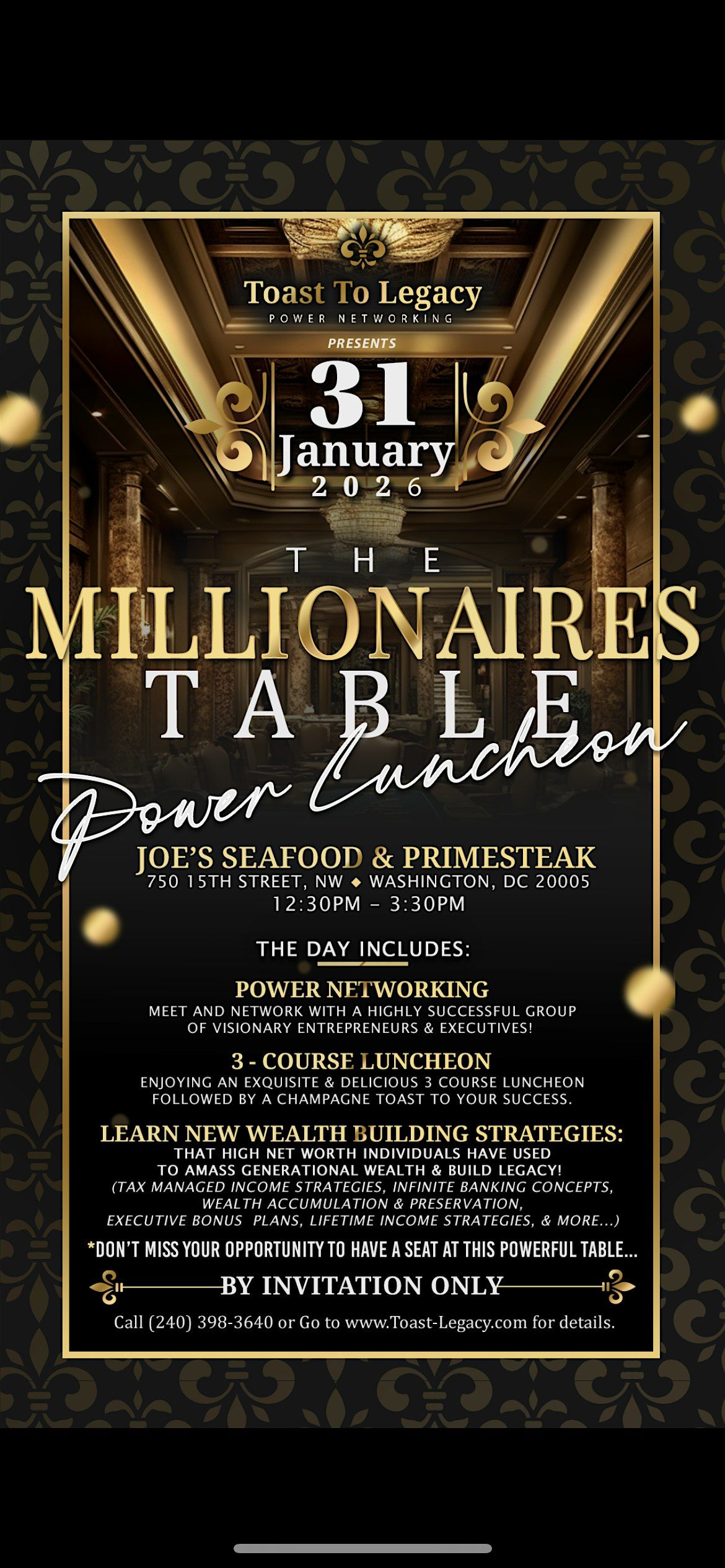 Welcome to the Build Financial Success at the Millionaires Table Masterclass happening at Joe's Seafood, Prime Steak & Stone Crab on January 31, 2026 at 12:30 PM (Eastern Time). Get ready to dive into strategies for financial growth and success!
