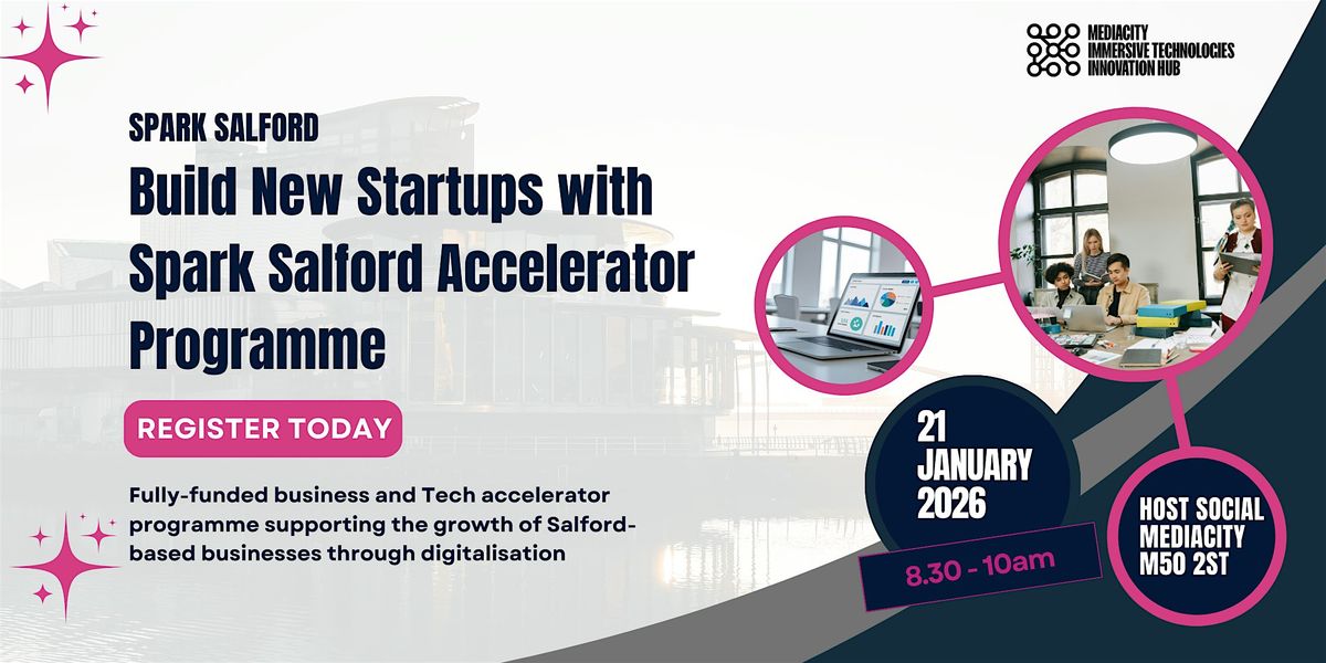 Join us for an inspiring and informal business networking breakfast at MediaCity’s Immersive Technologies Innovation Hub in Salford. This event bringing together startup founders and tech entrepreneurs from Salford’s innovation ecosystem will take you through the SPARK SALFORD journey.