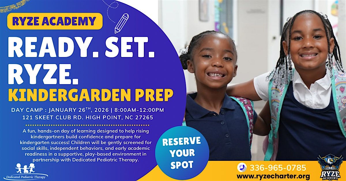 Welcome to Ready, Set, Ryze Kindergarten Prep Bootcamp! Join us at 121 Skeet Club Rd on January 26, 2026 at 8:00 AM (Eastern Time) for a fun-filled day of activities to prepare your little one for kindergarten. Get ready for games, crafts, and learning activities designed to boost your child's confidence and skills.