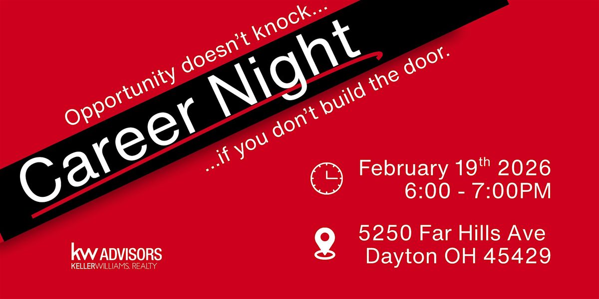 Welcome to Build the Door for Opportunity - Career Night! 🚀 Join us at 5250 Far Hills Ave ste 100 on February 19, 2026 at 6:00 PM (Eastern Time) for an evening filled with inspiration and insights into the world of real estate. This event is your chance to connect with professionals, gain valuable advice, and explore new opportunities. Don't miss out on this exciting opportunity to open doors to your future!