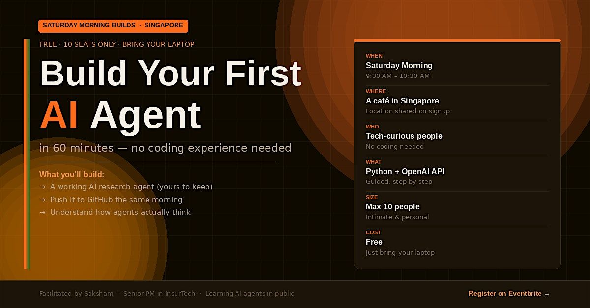Format: This is a small group session — max 10 people — so everyone gets personal attention. Facilitated by Saksham, a Senior Product Manager in InsurTech who is on his own 90-day journey to master AI agents and wants to learn in public alongside you.